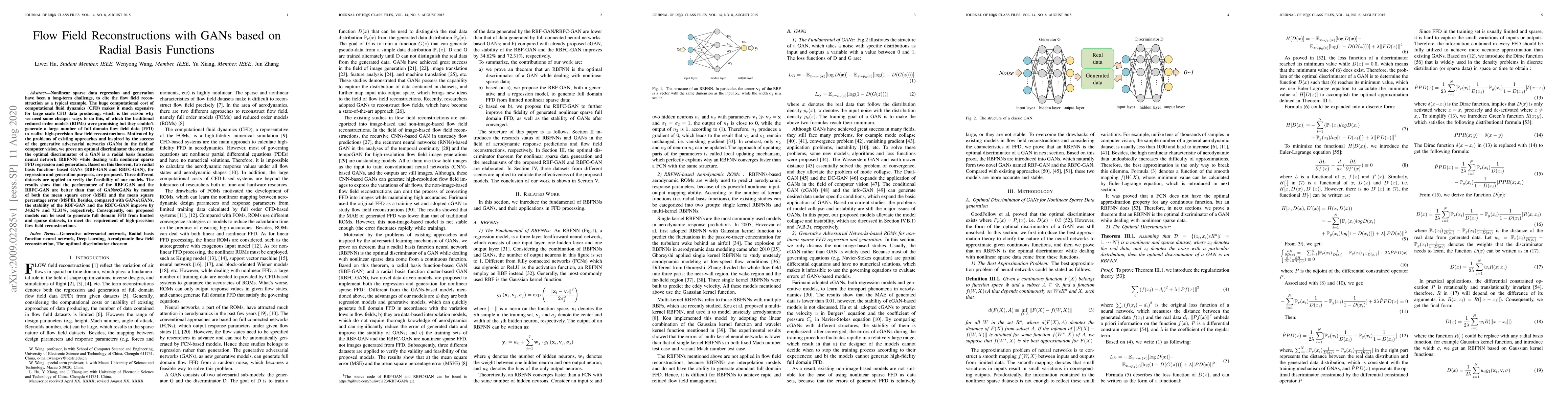 Nonlinear sparse data regression and generation have been a long-term challenge, to cite the flow field reconstruction as a typical example. The huge computational cost of computational fluid dynamics (CFD) makes it much expensive for large scale CFD data producing, which is the reason why we need some cheaper ways to do this, of which the traditional reduced order models (ROMs) were promising but they couldn't generate a large number of full domain flow field data (FFD) to realize high-precision flow field reconstructions. Motivated by the problems of existing approaches and inspired by the success of the generative adversarial networks (GANs) in the field of computer vision, we prove an optimal discriminator theorem that the optimal discriminator of a GAN is a radial basis function neural network (RBFNN) while dealing with nonlinear sparse FFD regression and generation. Based on this theorem, two radial basis function-based GANs (RBF-GAN and RBFC-GAN), for regression and generation purposes, are proposed. Three different datasets are applied to verify the feasibility of our models. The results show that the performance of the RBF-GAN and the RBFC-GAN are better than that of GANs/cGANs by means of both the mean square error (MSE) and the mean square percentage error (MSPE). Besides, compared with GANs/cGANs, the stability of the RBF-GAN and the RBFC-GAN improve by 34.62% and 72.31%, respectively. Consequently, our proposed models can be used to generate full domain FFD from limited and sparse datasets, to meet the requirement of high-precision flow field reconstructions.