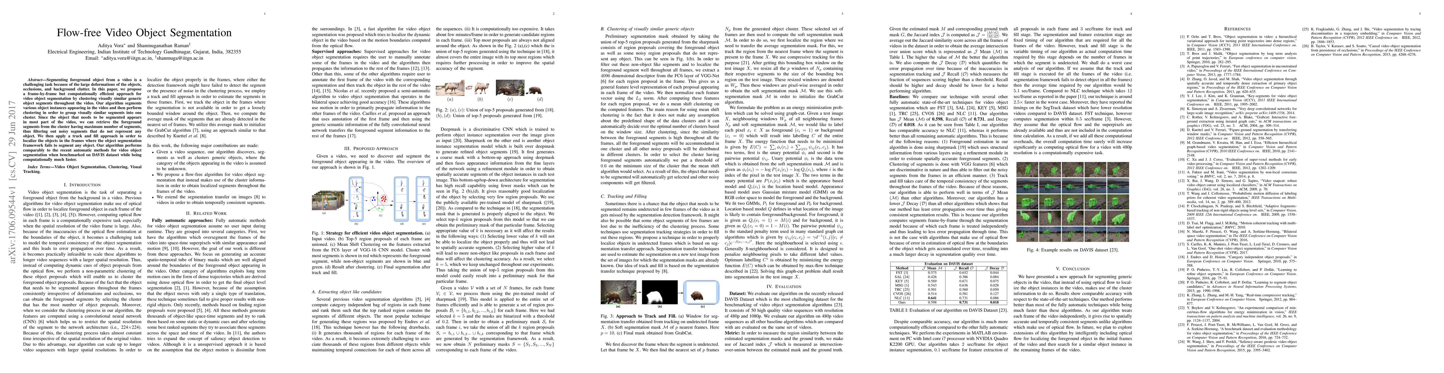 This paper proposes a computationally efficient method for segmenting objects in videos by clustering visually similar segments frame-by-frame. The algorithm retrieves the foreground object from the cluster with the most segments and uses a track and fill approach to handle segmentation failures, achieving competitive performance on the DAVIS dataset.