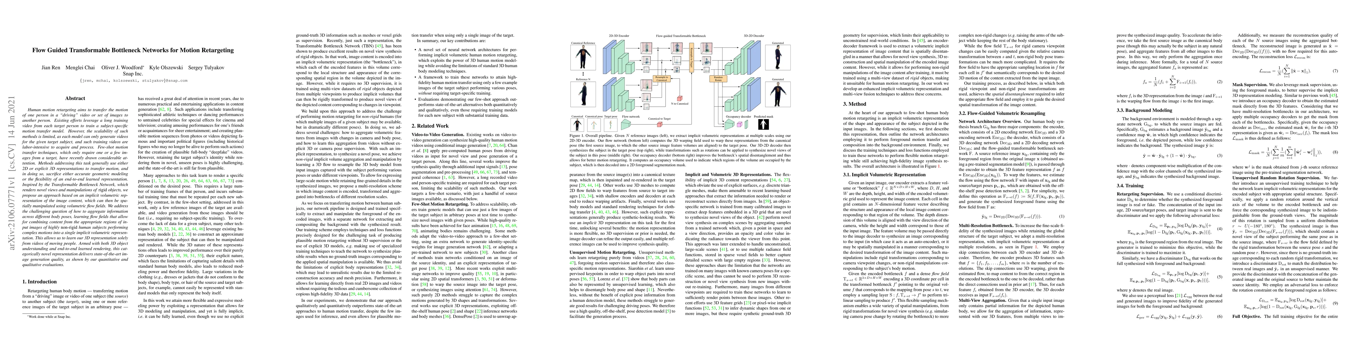 This paper proposes a novel approach for few-shot human motion retargeting using flow guided transformable bottleneck networks. It leverages an implicit volumetric representation manipulated by volumetric flow fields to achieve accurate 3D modeling and flexible end-to-end learning, enabling state-of-the-art motion transfer from limited input data.