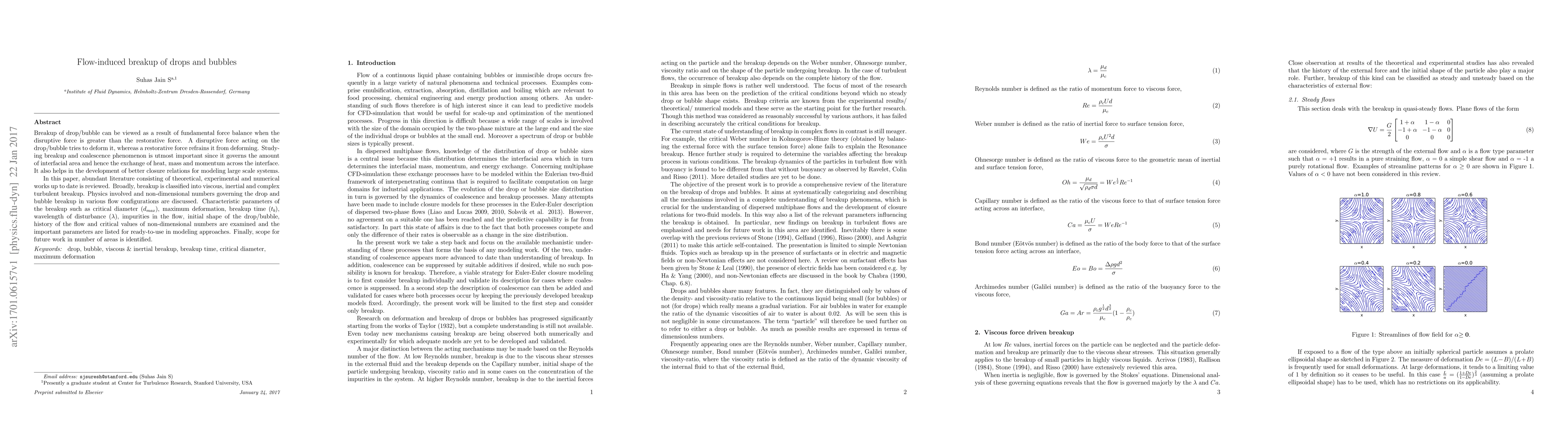 Breakup of drop/bubble can be viewed as a result of fundamental force balance when the disruptive force is greater than the restorative force. A disruptive force acting on the drop/bubble tries to deform it, whereas a restorative force refrains it from deforming. Studying breakup and coalescence phenomenon is utmost important since it governs the amount of interfacial area and hence the exchange of heat, mass and momentum across the interface. It also helps in the development of better closure relations for modeling large scale systems. In this paper, abundant literature consisting of theoretical, experimental and numerical works up to date is reviewed. Broadly, breakup is classified into viscous, inertial and complex turbulent breakup. Physics involved and non-dimensional numbers governing the drop and bubble breakup in various flow configurations are discussed. Characteristic parameters of the breakup such as critical diameter ($d_{max}$), maximum deformation, breakup time ($t_b$), wavelength of disturbance ($\lambda$), impurities in the flow, initial shape of the drop/bubble, history of the flow and critical values of non-dimensional numbers are examined and the important parameters are listed for ready-to-use in modeling approaches. Finally, scope for future work in number of areas is identified.