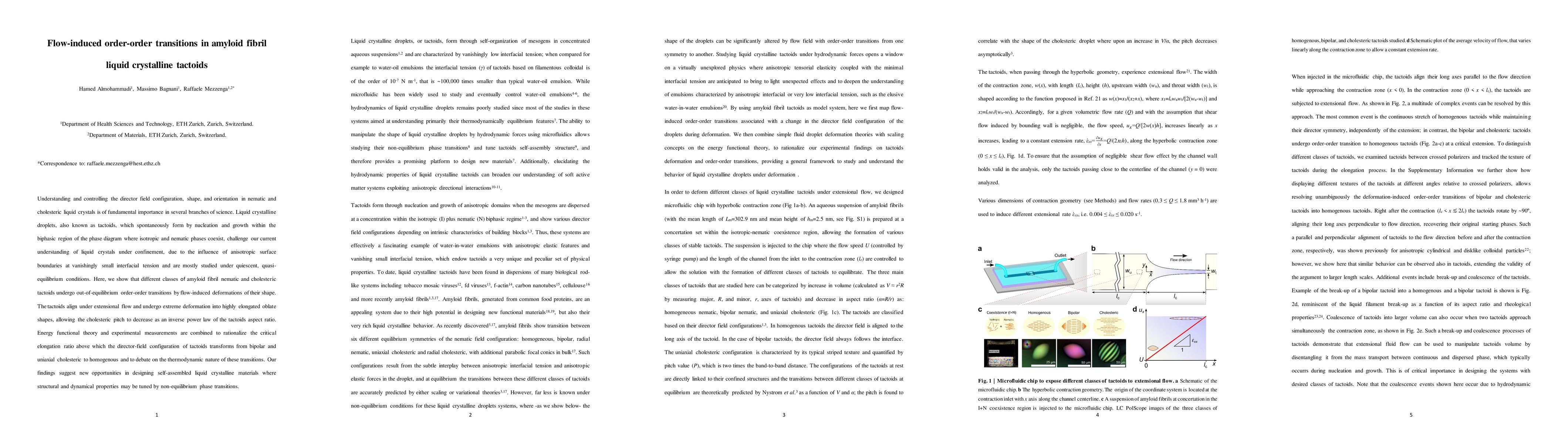 Understanding and controlling the director field configuration, shape, and orientation in nematic and cholesteric liquid crystals is of fundamental importance in several branches of science. Liquid crystalline droplets, also known as tactoids, which spontaneously form by nucleation and growth within the biphasic region of the phase diagram where isotropic and nematic phases coexist, challenge our current understanding of liquid crystals under confinement, due to the influence of anisotropic surface boundaries at vanishingly small interfacial tension and are mostly studied under quiescent, quasi-equilibrium conditions. Here, we show that different classes of amyloid fibril nematic and cholesteric tactoids undergo out-of-equilibrium order-order transitions by flow-induced deformations of their shape. The tactoids align under extensional flow and undergo extreme deformation into highly elongated oblate shapes, allowing the cholesteric pitch to decrease as an inverse power law of the tactoids aspect ratio. Energy functional theory and experimental measurements are combined to rationalize the critical elongation ratio above which the director-field configuration of tactoids transforms from bipolar and uniaxial cholesteric to homogenous and to debate on the thermodynamic nature of these transitions. Our findings suggest new opportunities in designing self-assembled liquid crystalline materials where structural and dynamical properties may be tuned by non-equilibrium phase transitions.