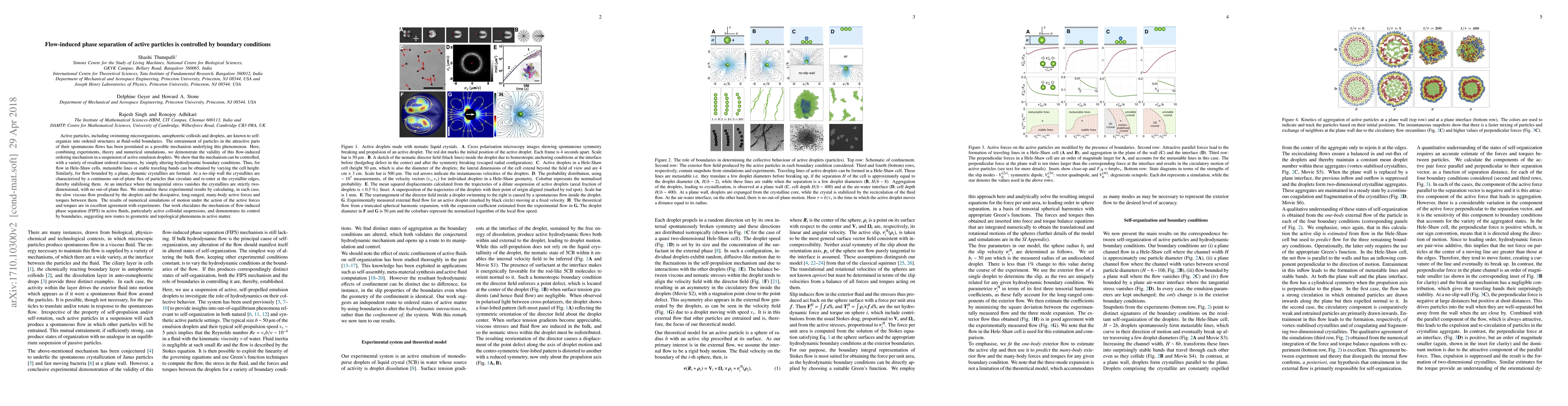 Active particles, including swimming microorganisms, autophoretic colloids and droplets, are known to self-organize into ordered structures at fluid-solid boundaries. The entrainment of particles in the attractive parts of their spontaneous flows has been postulated as a possible mechanism underlying this phenomenon. Here, combining experiments, theory and numerical simulations, we demonstrate the validity of this flow-induced ordering mechanism in a suspension of active emulsion droplets. We show that the mechanism can be controlled, with a variety of resultant ordered structures, by simply altering hydrodynamic boundary conditions. Thus, for flow in Hele-Shaw cells, metastable lines or stable traveling bands can be obtained by varying the cell height. Similarly, for flow bounded by a plane, dynamic crystallites are formed. At a no-slip wall the crystallites are characterised by a continuous out-of-plane flux of particles that circulate and re-enter at the crystallite edges, thereby stabilising them. At an interface where the tangential stress vanishes the crystallites are strictly two-dimensional, with no out-of-plane flux. We rationalize these experimental results by calculating, in each case, the slow viscous flow produced by the droplets and the dissipative, long-ranged, many-body active forces and torques between them. The results of numerical simulations of motion under the action of the active forces and torques are in excellent agreement with experiments. Our work elucidates the mechanism of flow-induced phase separation (FIPS) in active fluids, particularly active colloidal suspensions, and demonstrates its control by boundaries, suggesting new routes to geometric and topological phenomena in active matter.