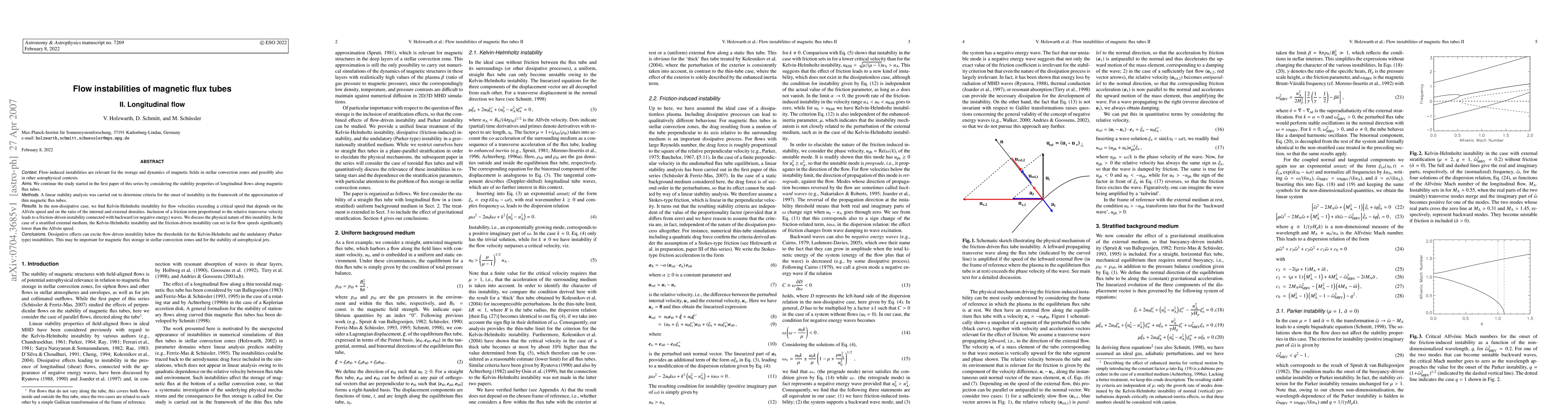 This paper investigates the stability of longitudinal flows within magnetic flux tubes, identifying conditions for flow-induced instabilities such as Kelvin-Helmholtz and friction-driven instabilities. It finds that these instabilities can occur at speeds lower than the Alfvén speed in stratified environments, with implications for magnetic flux storage in stellar convection zones and astrophysical jets.