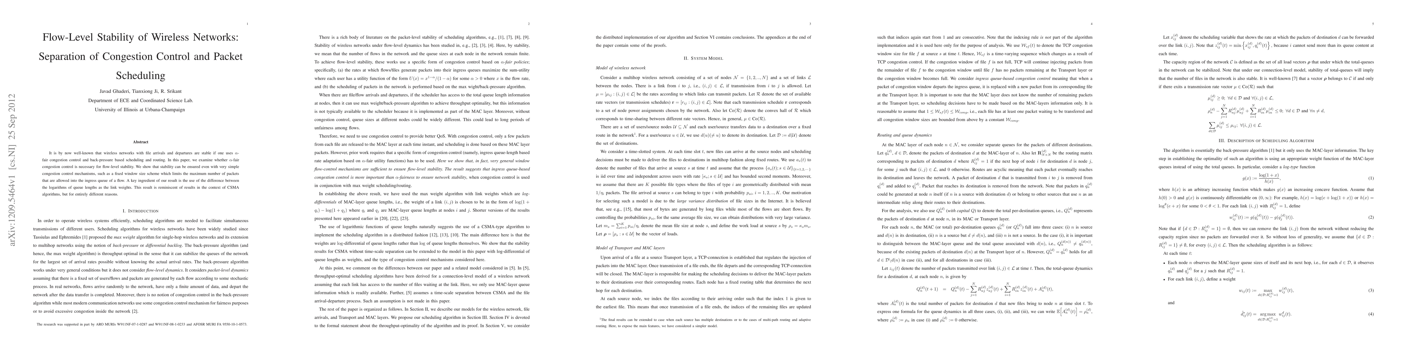 It is by now well-known that wireless networks with file arrivals and departures are stable if one uses alpha-fair congestion control and back-pressure based scheduling and routing. In this paper, we examine whether ?alpha-fair congestion control is necessary for flow-level stability. We show that stability can be ensured even with very simple congestion control mechanisms, such as a fixed window size scheme which limits the maximum number of packets that are allowed into the ingress queue of a flow. A key ingredient of our result is the use of the difference between the logarithms of queue lengths as the link weights. This result is reminiscent of results in the context of CSMA algorithms, but for entirely different reasons.