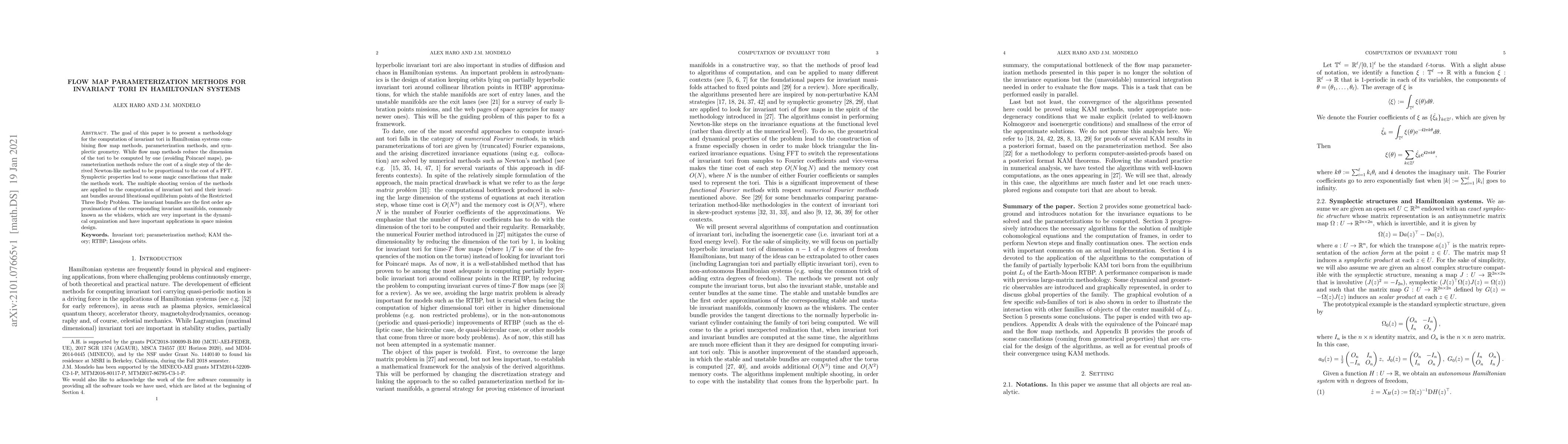 This paper introduces a method combining flow map, parameterization, and symplectic geometry techniques to compute invariant tori in Hamiltonian systems, reducing computational costs and leveraging symplectic properties for efficiency. The approach is applied to the Restricted Three Body Problem to determine invariant tori and their bundles, crucial for space mission design.