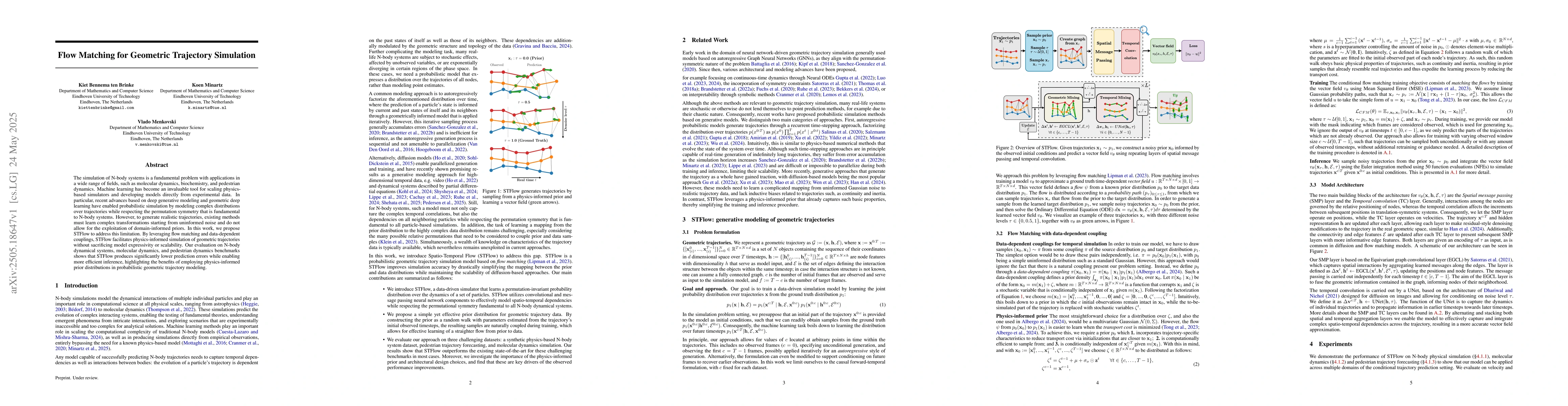 The research proposes STFlow, a method utilizing flow matching and data-dependent couplings to facilitate physics-informed simulation of geometric trajectories, preserving model expressivity and scalability.