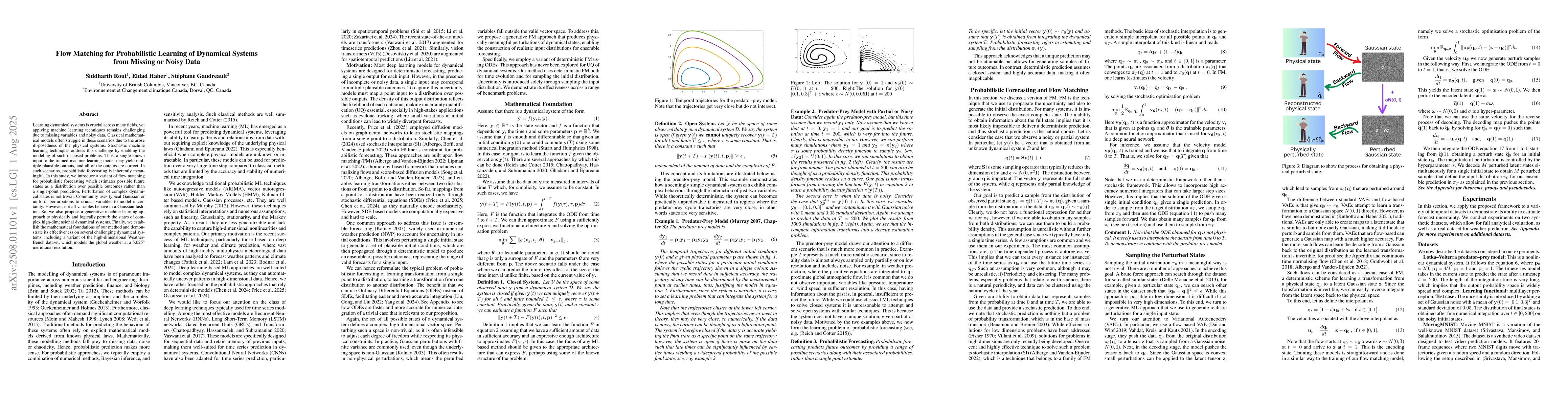 Learning dynamical systems is crucial across many fields, yet applying machine learning techniques remains challenging due to missing variables and noisy data. Classical mathematical models often struggle in these scenarios due to the arose ill-posedness of the physical systems. Stochastic machine learning techniques address this challenge by enabling the modeling of such ill-posed problems. Thus, a single known input to the trained machine learning model may yield multiple plausible outputs, and all of the outputs are correct. In such scenarios, probabilistic forecasting is inherently meaningful. In this study, we introduce a variant of flow matching for probabilistic forecasting which estimates possible future states as a distribution over possible outcomes rather than a single-point prediction. Perturbation of complex dynamical states is not trivial. Community uses typical Gaussian or uniform perturbations to crucial variables to model uncertainty. However, not all variables behave in a Gaussian fashion. So, we also propose a generative machine learning approach to physically and logically perturb the states of complex high-dimensional dynamical systems. Finally, we establish the mathematical foundations of our method and demonstrate its effectiveness on several challenging dynamical systems, including a variant of the high-dimensional WeatherBench dataset, which models the global weather at a 5.625{\deg} meridional resolution.