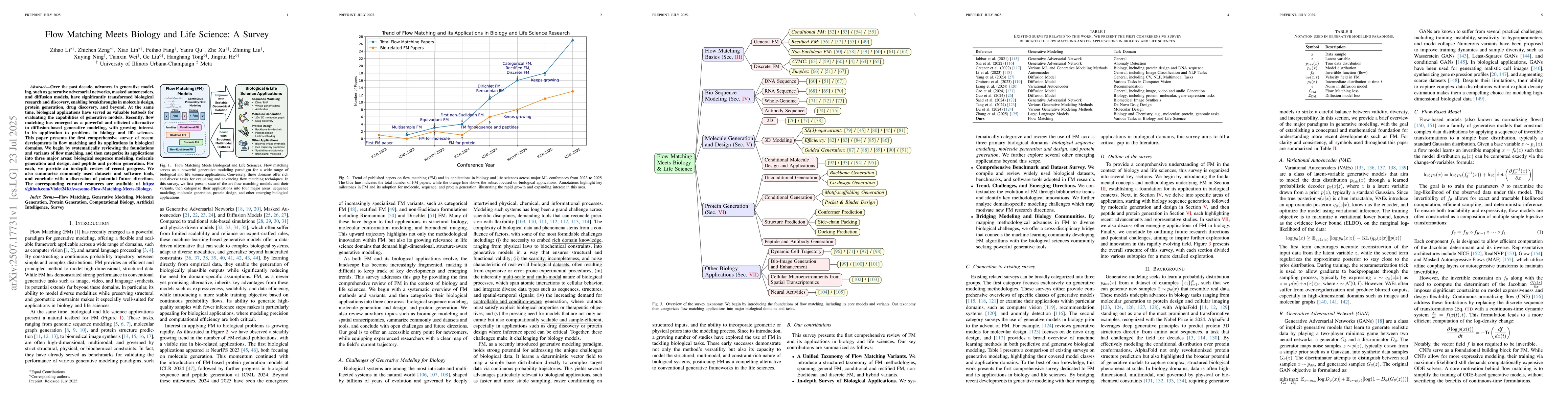 The paper presents a comprehensive survey of flow matching, a generative modeling approach, and its applications in biology and life sciences, covering foundations, variants, and applications in sequence modeling, molecule generation, and protein generation.