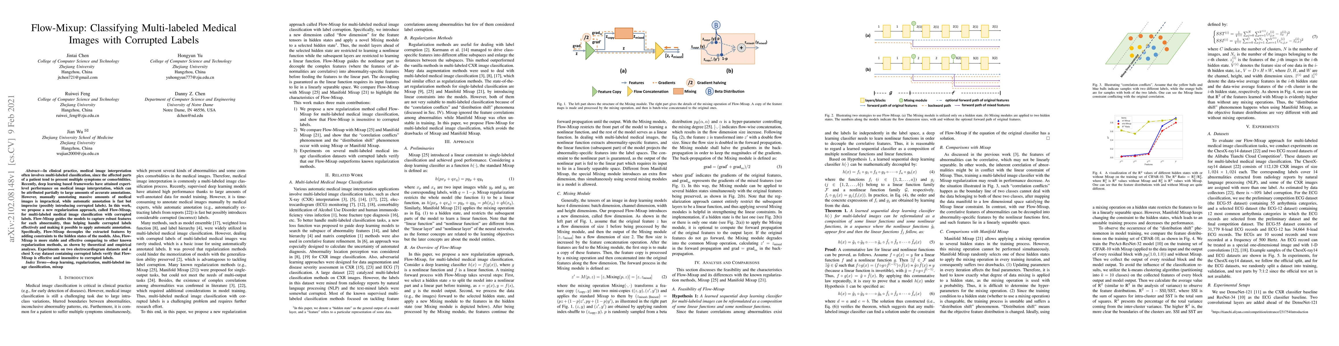 In clinical practice, medical image interpretation often involves multi-labeled classification, since the affected parts of a patient tend to present multiple symptoms or comorbidities. Recently, deep learning based frameworks have attained expert-level performance on medical image interpretation, which can be attributed partially to large amounts of accurate annotations. However, manually annotating massive amounts of medical images is impractical, while automatic annotation is fast but imprecise (possibly introducing corrupted labels). In this work, we propose a new regularization approach, called Flow-Mixup, for multi-labeled medical image classification with corrupted labels. Flow-Mixup guides the models to capture robust features for each abnormality, thus helping handle corrupted labels effectively and making it possible to apply automatic annotation. Specifically, Flow-Mixup decouples the extracted features by adding constraints to the hidden states of the models. Also, Flow-Mixup is more stable and effective comparing to other known regularization methods, as shown by theoretical and empirical analyses. Experiments on two electrocardiogram datasets and a chest X-ray dataset containing corrupted labels verify that Flow-Mixup is effective and insensitive to corrupted labels.