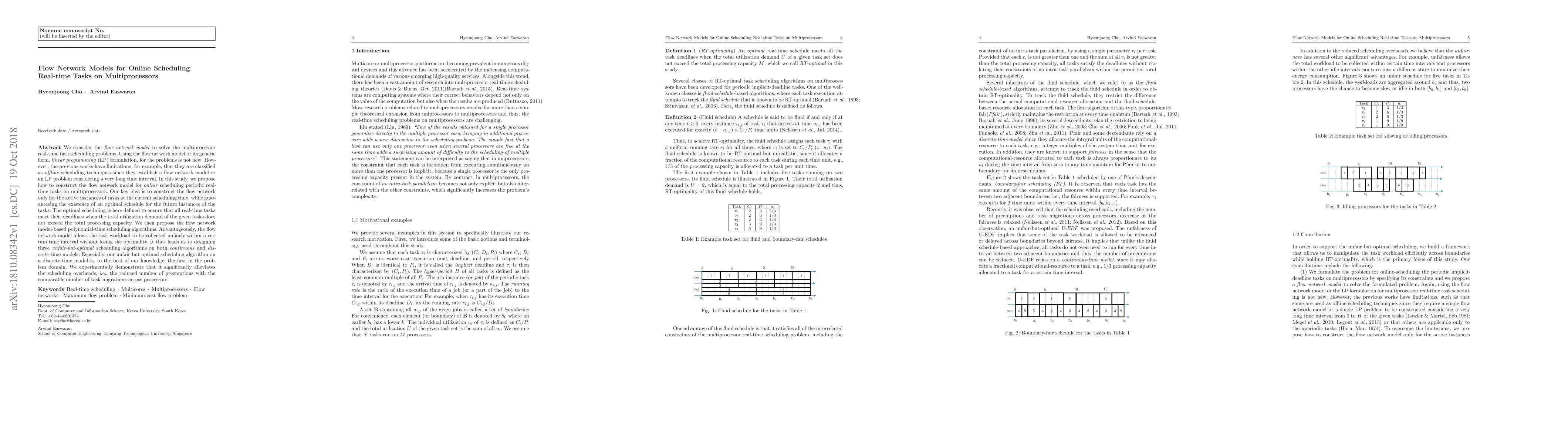 This paper proposes a flow network model for online scheduling of periodic real-time tasks on multiprocessors, focusing on constructing the model for active task instances at current scheduling time. The authors introduce polynomial-time scheduling algorithms that ensure optimal task scheduling without exceeding processing capacity, demonstrating reduced scheduling overheads and presenting the first unfair-but-optimal scheduling algorithm for discrete-time models.