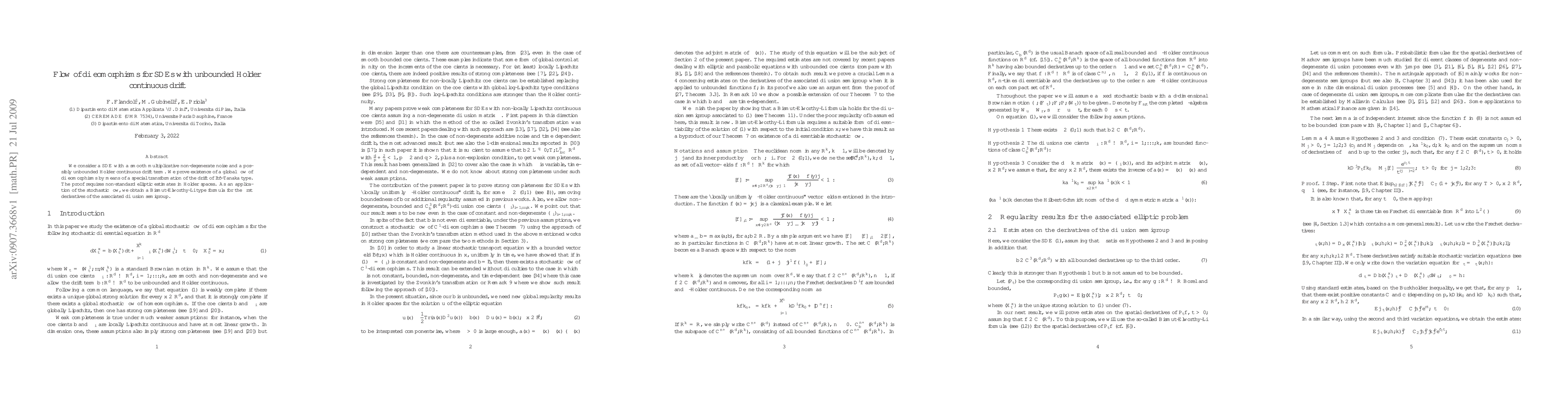 We consider a SDE with a smooth multiplicative non-degenerate noise and a possibly unbounded Holder continuous drift term. We prove existence of a global flow of diffeomorphisms by means of a special transformation of the drift of Ito-Tanaka type. The proof requires non-standard elliptic estimates in Holder spaces. As an application of the stochastic flow, we obtain a Bismut-Elworthy-Li type formula for the first derivatives of the associated diffusion semigroup.
