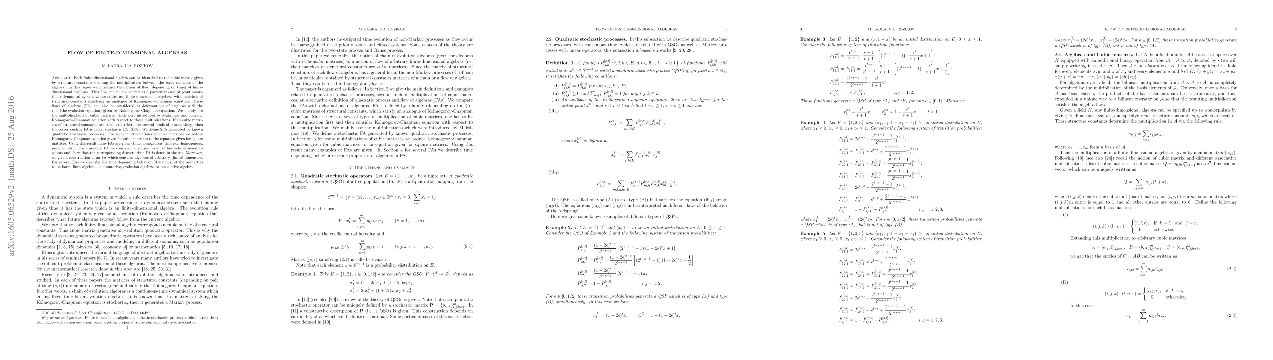 This paper introduces the concept of flow of finite-dimensional algebras, which are represented by cubic matrices of structural constants. The flow is modeled as a continuous-time dynamical system governed by the Kolmogorov-Chapman equation, and it is shown to be a deformation of algebras. The study also explores stochastic flows of algebras and their properties, including periodic behaviors and the density of discrete time flows in a continuum set of finite-dimensional algebras.