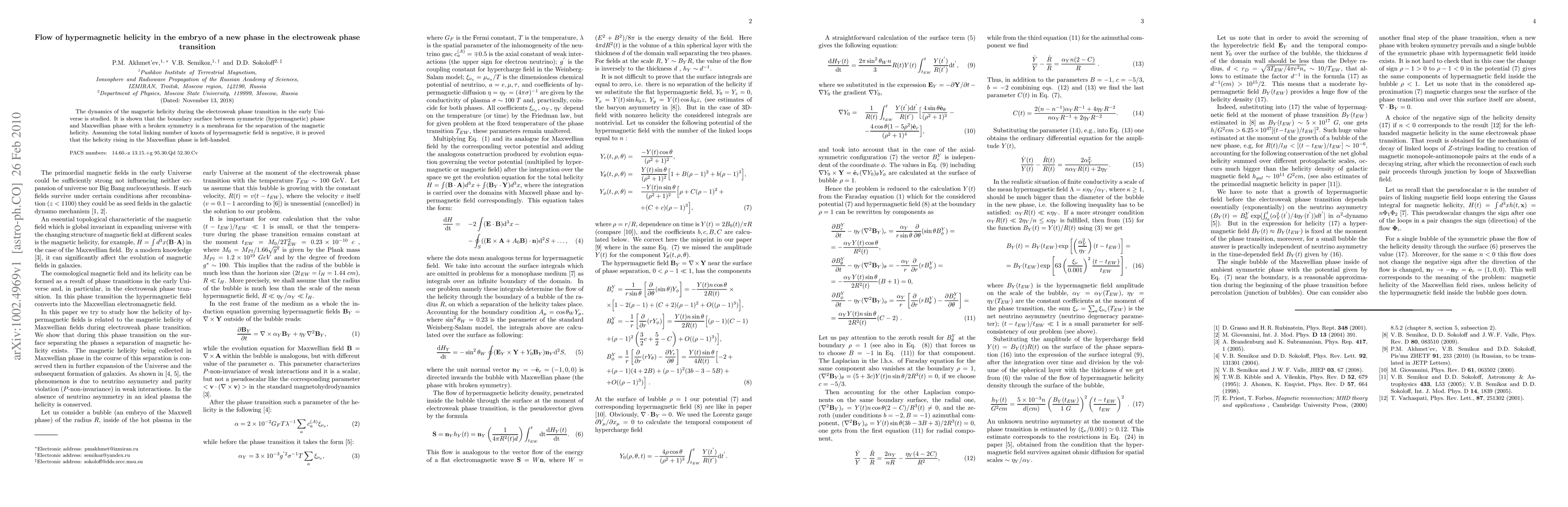 The dynamics of the magnetic helicity during the electroweak phase transition in the early Universe is studied. It is shown that the boundary surface between symmetric (hypermagnetic) phase and Maxwellian phase with a broken symmetry is a membrana for the separation of the magnetic helicity. Assuming the total linking number of knots of hypermagnetic field is negative, it is proved that the helicity rising in the Maxwellian phase is left-handed.