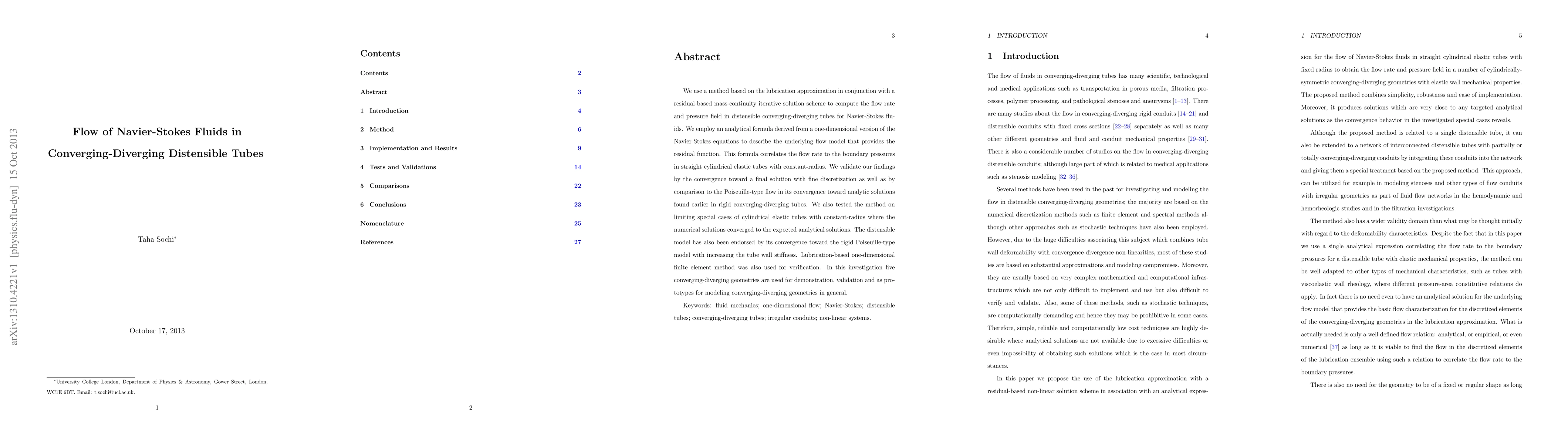 This study employs a lubrication approximation and iterative solution scheme to compute flow rates and pressure fields in distensible converging-diverging tubes for Navier-Stokes fluids. The method is validated against Poiseuille-type flow and special cases, demonstrating convergence to analytical solutions and confirming the model's applicability to various converging-diverging geometries.