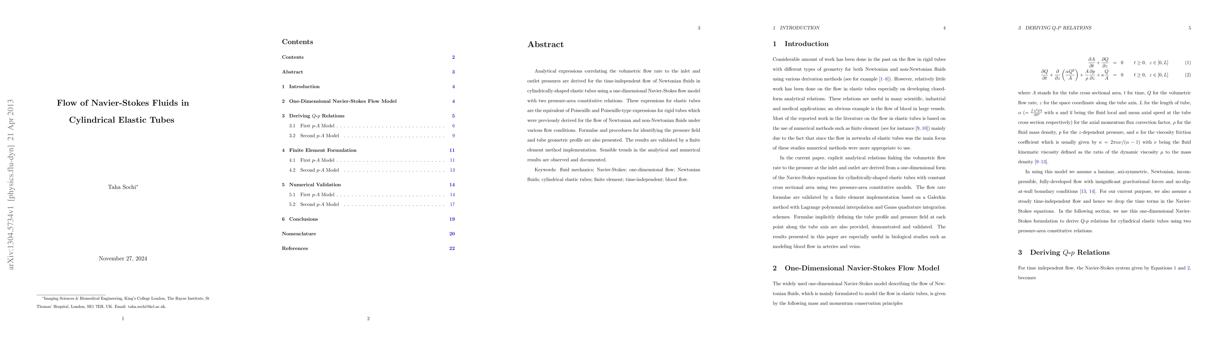 This paper derives analytical expressions for the volumetric flow rate in elastic cylindrical tubes based on the Navier-Stokes equations, analogous to Poiseuille's law for rigid tubes. The study validates these expressions using finite element methods and observes consistent trends between analytical and numerical results.