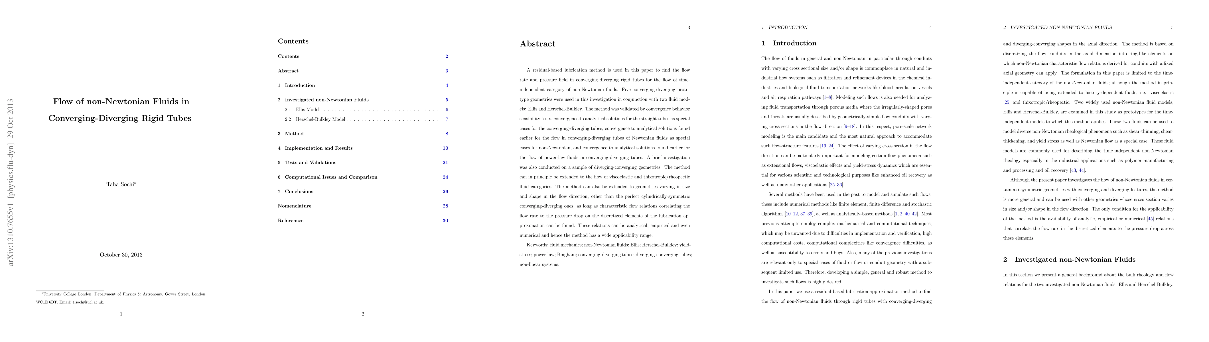 This paper employs a residual-based lubrication method to determine flow rate and pressure fields for time-independent non-Newtonian fluids in converging-diverging rigid tubes, validated against various analytical solutions. The method's applicability extends to other non-Newtonian fluid categories and non-cylindrical geometries.