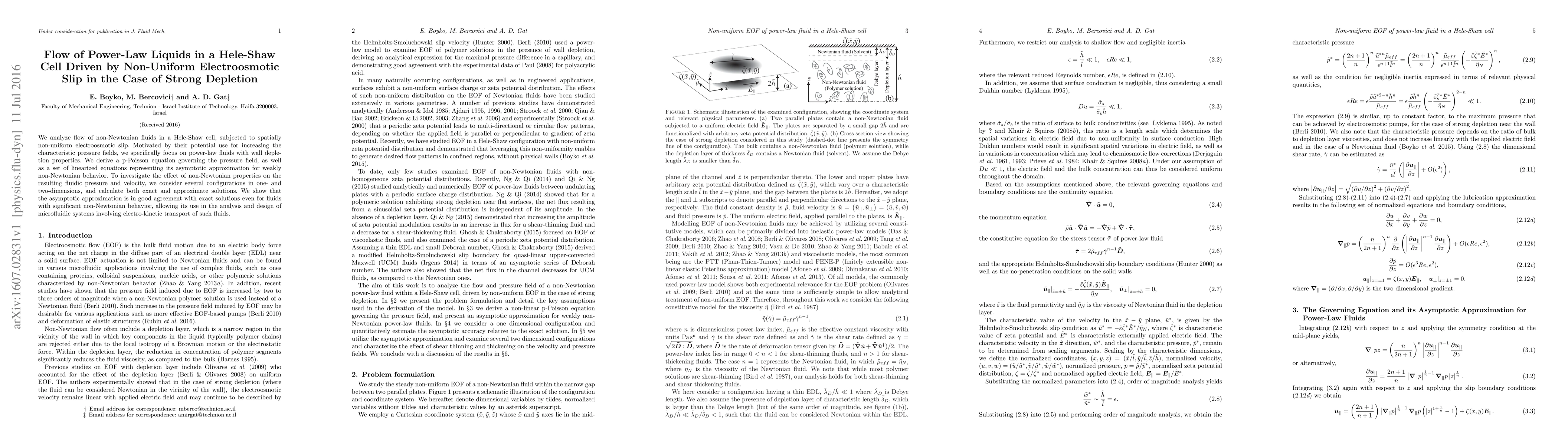 This paper investigates the flow of power-law liquids in a Hele-Shaw cell driven by non-uniform electroosmotic slip, particularly under strong depletion conditions. It derives a p-Poisson equation for the pressure field and provides an asymptotic approximation for weakly non-Newtonian behavior, showing good agreement with exact solutions and useful for designing microfluidic systems.