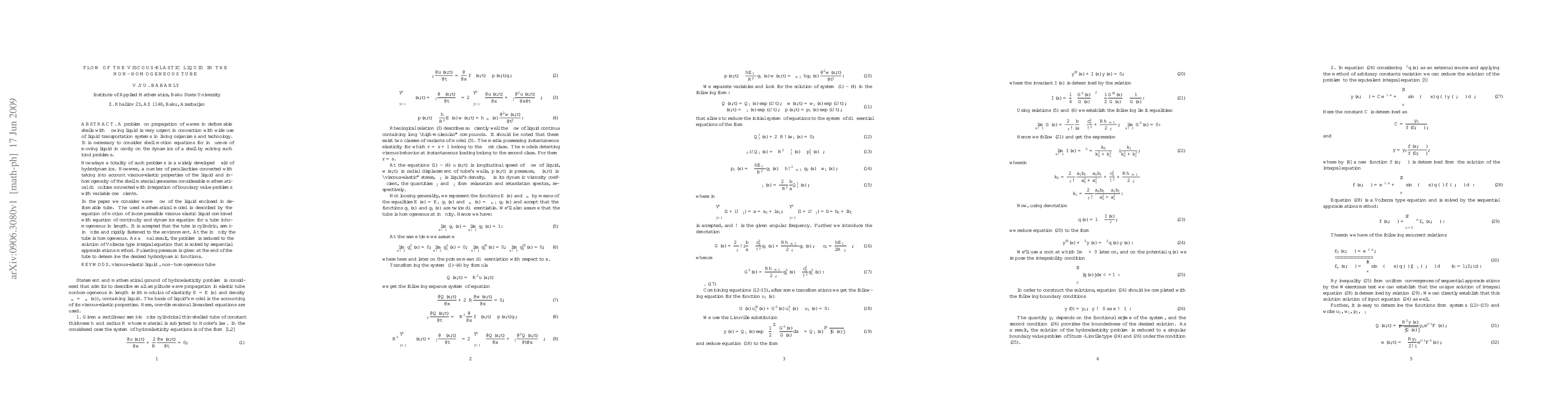 This paper investigates wave propagation in viscous-elastic liquid flowing through a deformable, inhomogeneous tube, addressing mathematical challenges in modeling the liquid's dynamics and the tube's motion. The solution employs a Volterra integral equation approach and pulsating pressure at the tube's end to determine hydrodynamic functions.
