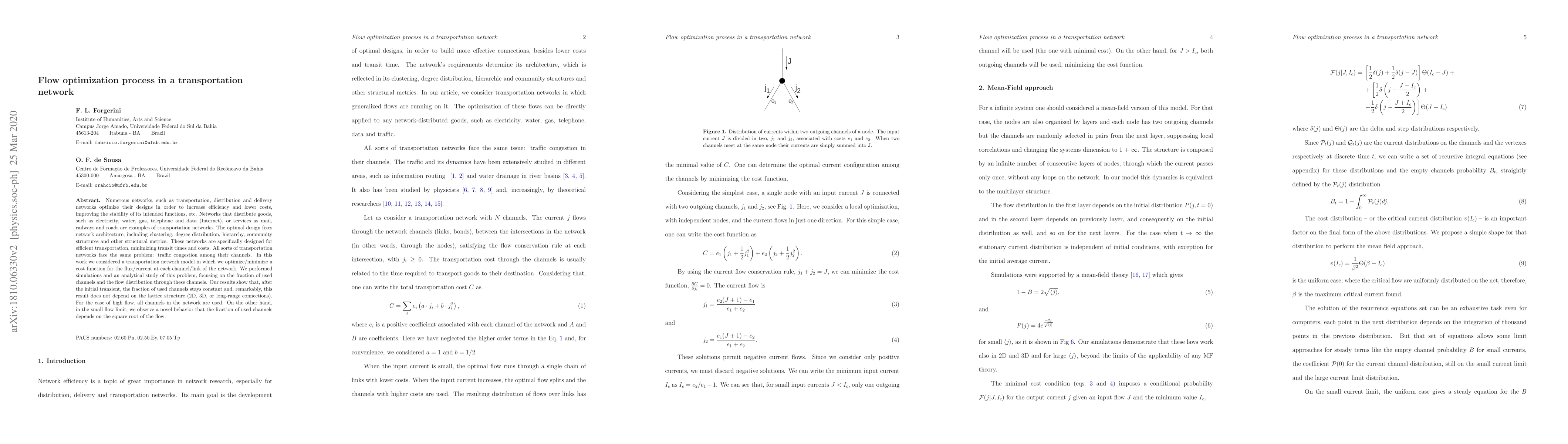 This paper explores the optimization of transportation networks to enhance efficiency and reduce costs, focusing on minimizing congestion and transit times. The study reveals a consistent fraction of used channels post-transient, independent of the network's structure, and shows a unique dependency on the square root of flow in low-flow scenarios.
