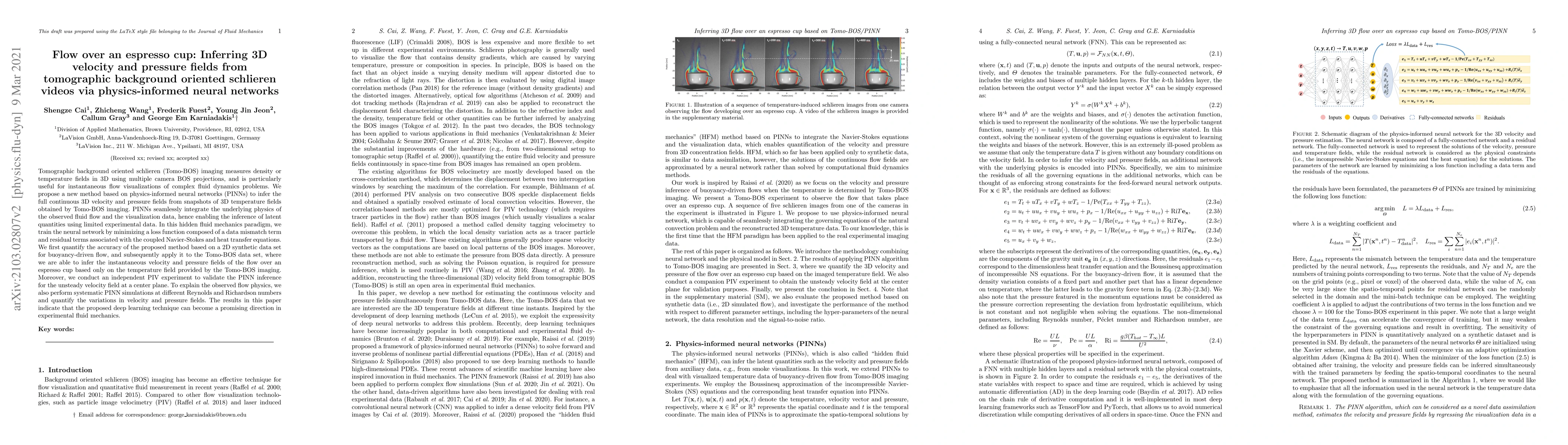 This paper proposes a method using physics-informed neural networks (PINNs) to infer 3D velocity and pressure fields from tomographic background oriented schlieren (Tomo-BOS) imaging data. The method integrates fluid dynamics physics with limited experimental data, enabling accurate inference of latent flow properties, validated through synthetic and real-world experiments on espresso cup flow.