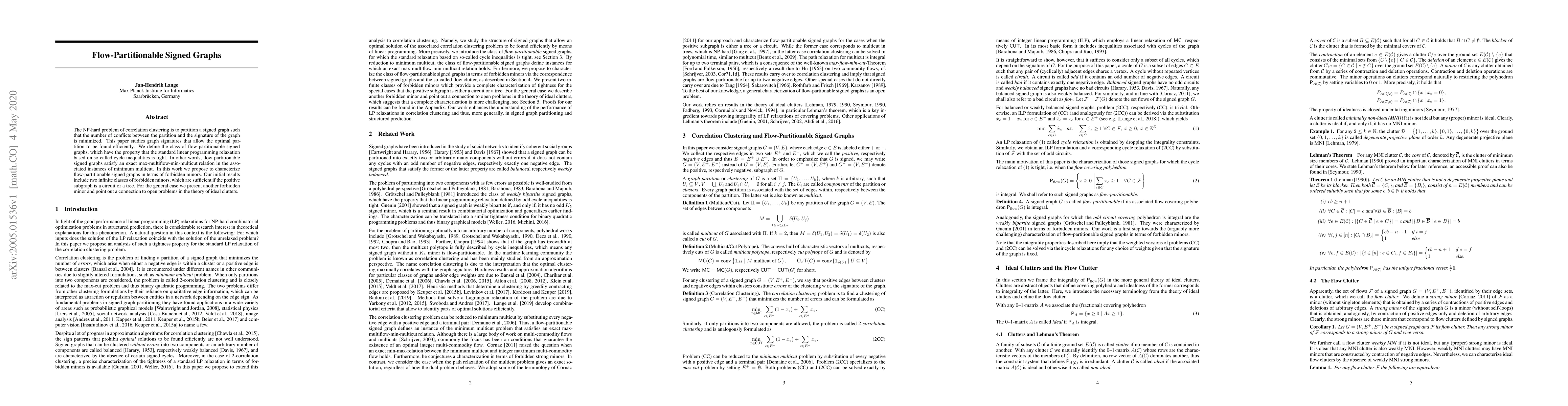 The NP-hard problem of correlation clustering is to partition a signed graph such that the number of conflicts between the partition and the signature of the graph is minimized. This paper studies graph signatures that allow the optimal partition to be found efficiently. We define the class of flow-partitionable signed graphs, which have the property that the standard linear programming relaxation based on so-called cycle inequalities is tight. In other words, flow-partitionable signed graphs satisfy an exact max-multiflow-min-multicut relation in the associated instances of minimum multicut. In this work we propose to characterize flow-partitionable signed graphs in terms of forbidden minors. Our initial results include two infinite classes of forbidden minors, which are sufficient if the positive subgraph is a circuit or a tree. For the general case we present another forbidden minor and point out a connection to open problems in the theory of ideal clutters.