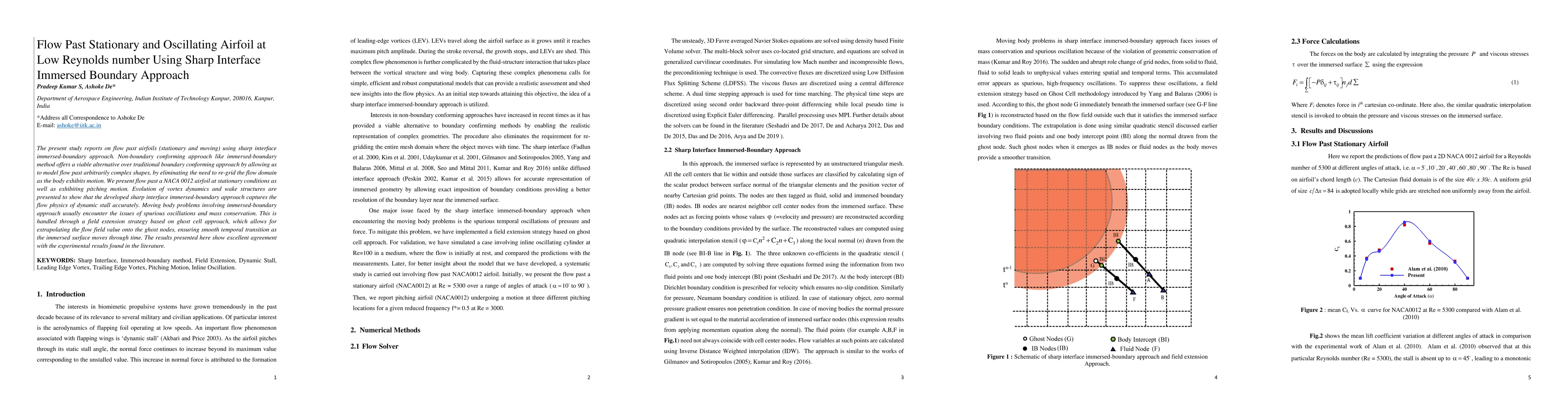 This study employs a sharp interface immersed-boundary approach to model flow past stationary and oscillating NACA 0012 airfoils at low Reynolds number, capturing vortex dynamics and wake structures accurately. The method addresses spurious oscillations and mass conservation issues using a ghost cell field extension strategy, showing good agreement with experimental data.