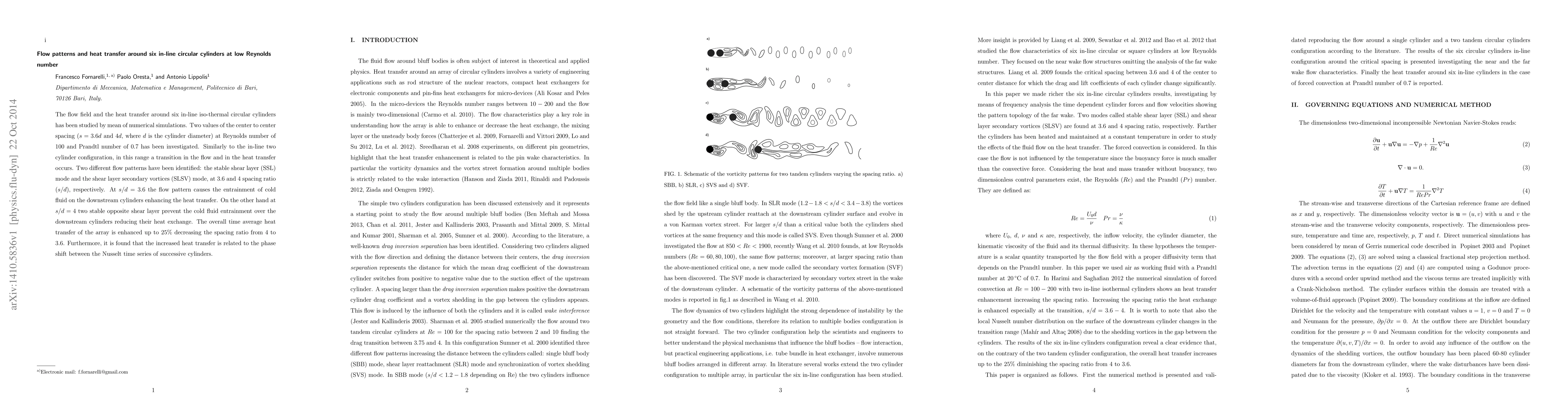 This study investigates the flow patterns and heat transfer around six in-line isothermal circular cylinders using numerical simulations at low Reynolds number. Two spacing ratios ($s/d=3.6$ and $4$) show distinct flow patterns and heat transfer efficiencies, with enhanced heat transfer up to 25% at $s/d=3.6$ due to better cold fluid entrainment.