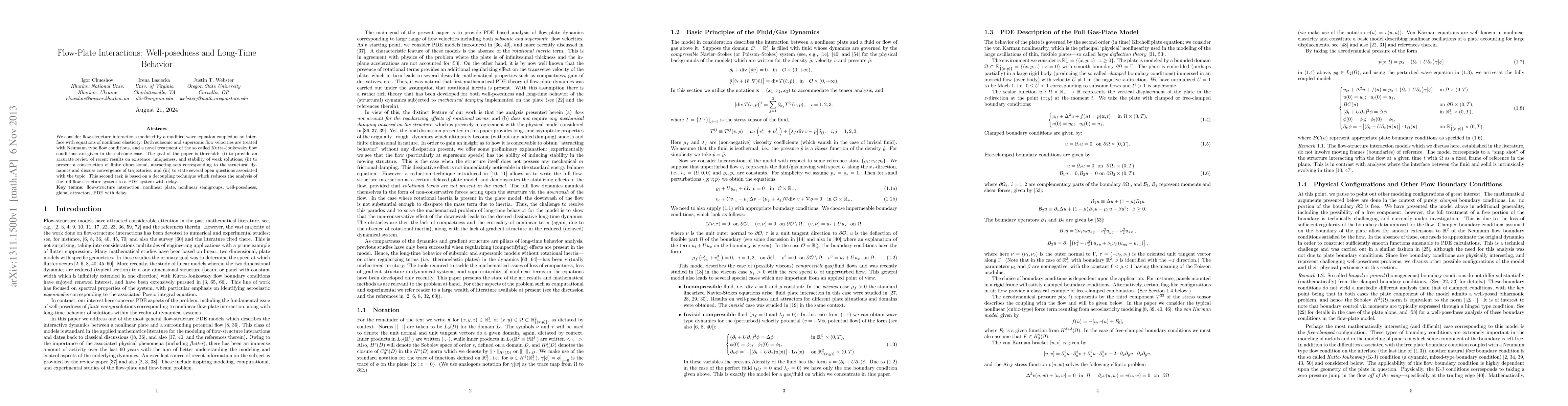 We consider flow-structure interactions modeled by a modified wave equation coupled at an interface with equations of nonlinear elasticity. Both subsonic and supersonic flow velocities are treated with Neumann type flow conditions, and a novel treatment of the so called Kutta-Joukowsky flow conditions are given in the subsonic case. The goal of the paper is threefold: (i) to provide an accurate review of recent results on existence, uniqueness, and stability of weak solutions, (ii) to present a construction of finite dimensional, attracting sets corresponding to the structural dynamics and discuss convergence of trajectories, and (iii) to state several open questions associated with the topic. This second task is based on a decoupling technique which reduces the analysis of the full flow-structure system to a PDE system with delay.