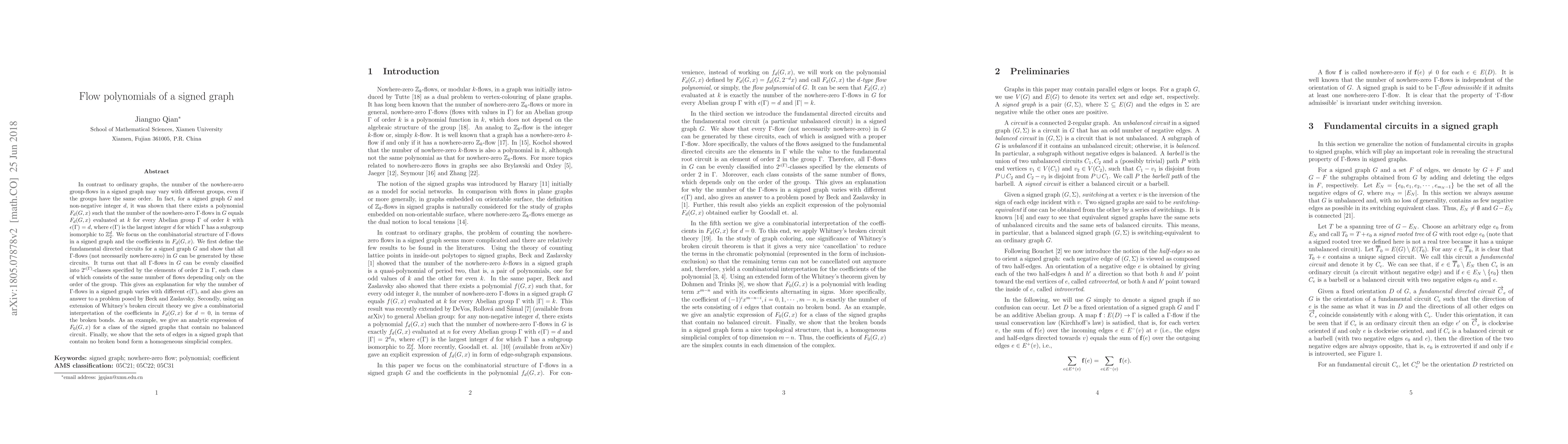Research finds that the number of flow polynomials in a signed graph can vary with different groups, even if they have the same order, and provides a combinatorial interpretation of these coefficients using broken circuit theory.