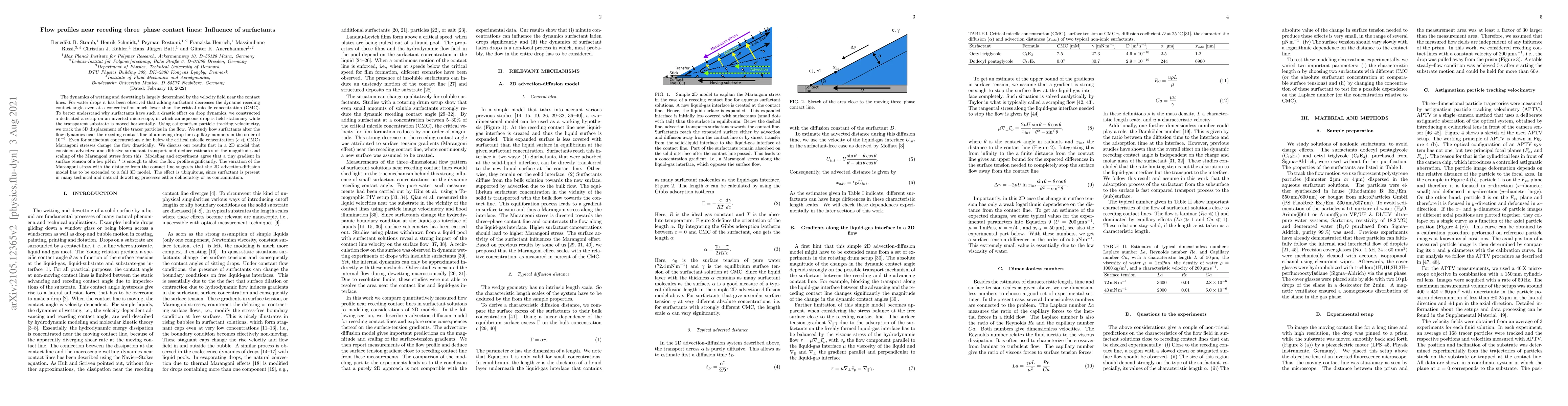 This study investigates how surfactants drastically alter the flow dynamics near receding three-phase contact lines, revealing that even low surfactant concentrations induce significant changes in Marangoni stresses. Experimental observations and a 2D advection-diffusion model suggest that small surface tension gradients can greatly modify flow profiles, necessitating a transition to a 3D model for accurate predictions.