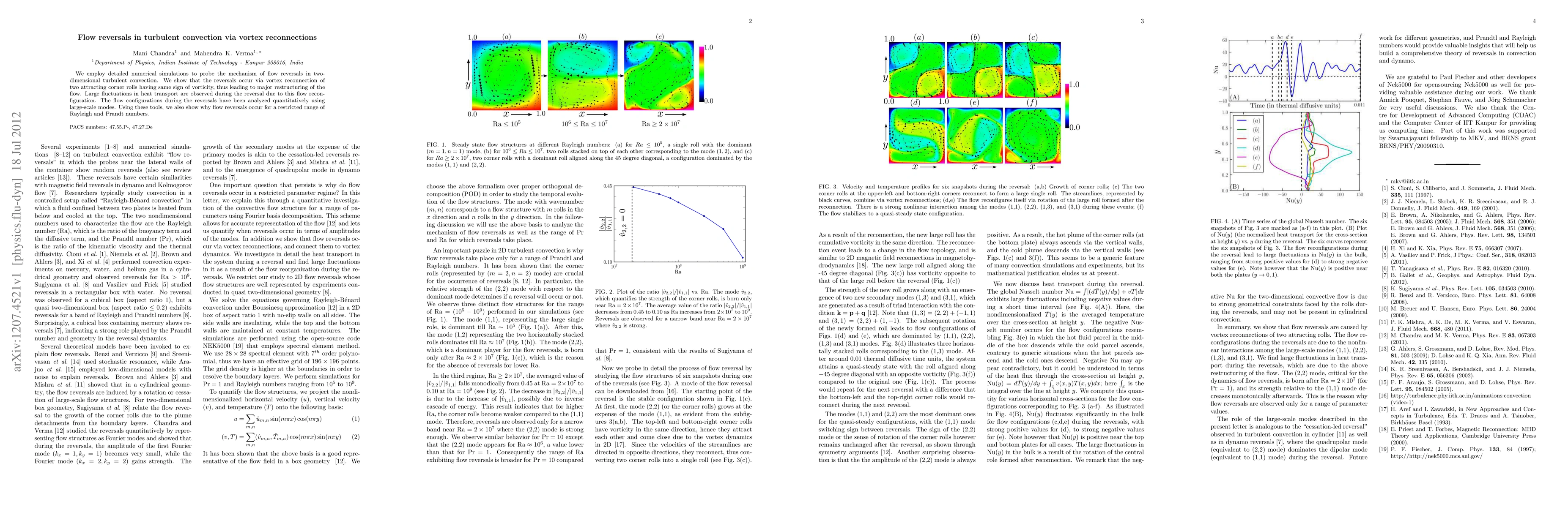 This study uses numerical simulations to reveal that flow reversals in turbulent convection are driven by vortex reconnections between corner rolls of the same vorticity sign, leading to significant flow restructuring and large heat transport fluctuations. The analysis shows these reversals occur within a specific range of Rayleigh and Prandtl numbers.