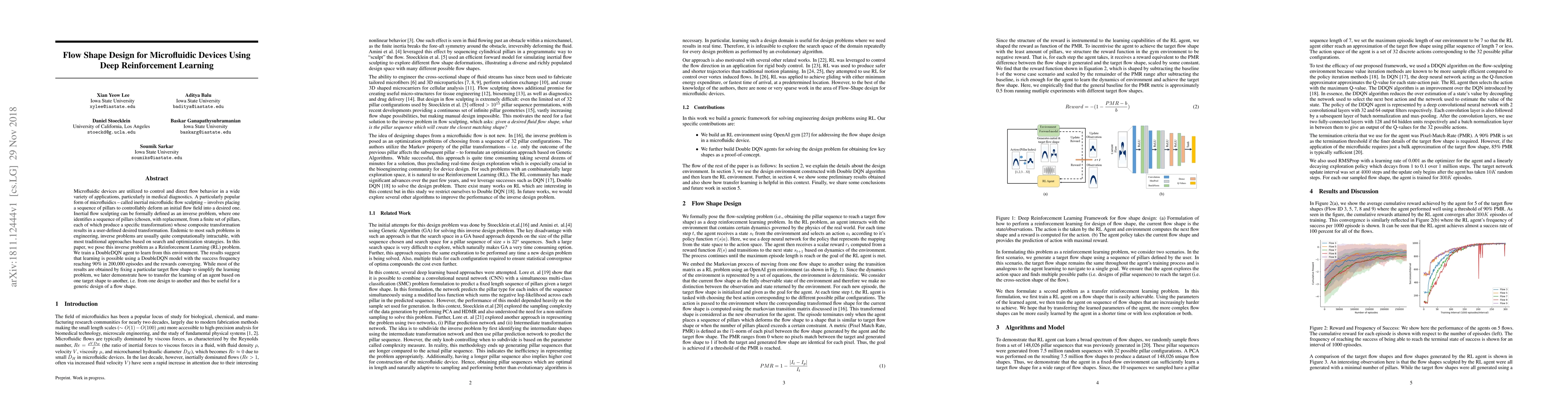 Microfluidic devices are utilized to control and direct flow behavior in a wide variety of applications, particularly in medical diagnostics. A particularly popular form of microfluidics -- called inertial microfluidic flow sculpting -- involves placing a sequence of pillars to controllably deform an initial flow field into a desired one. Inertial flow sculpting can be formally defined as an inverse problem, where one identifies a sequence of pillars (chosen, with replacement, from a finite set of pillars, each of which produce a specific transformation) whose composite transformation results in a user-defined desired transformation. Endemic to most such problems in engineering, inverse problems are usually quite computationally intractable, with most traditional approaches based on search and optimization strategies. In this paper, we pose this inverse problem as a Reinforcement Learning (RL) problem. We train a DoubleDQN agent to learn from this environment. The results suggest that learning is possible using a DoubleDQN model with the success frequency reaching 90% in 200,000 episodes and the rewards converging. While most of the results are obtained by fixing a particular target flow shape to simplify the learning problem, we later demonstrate how to transfer the learning of an agent based on one target shape to another, i.e. from one design to another and thus be useful for a generic design of a flow shape.