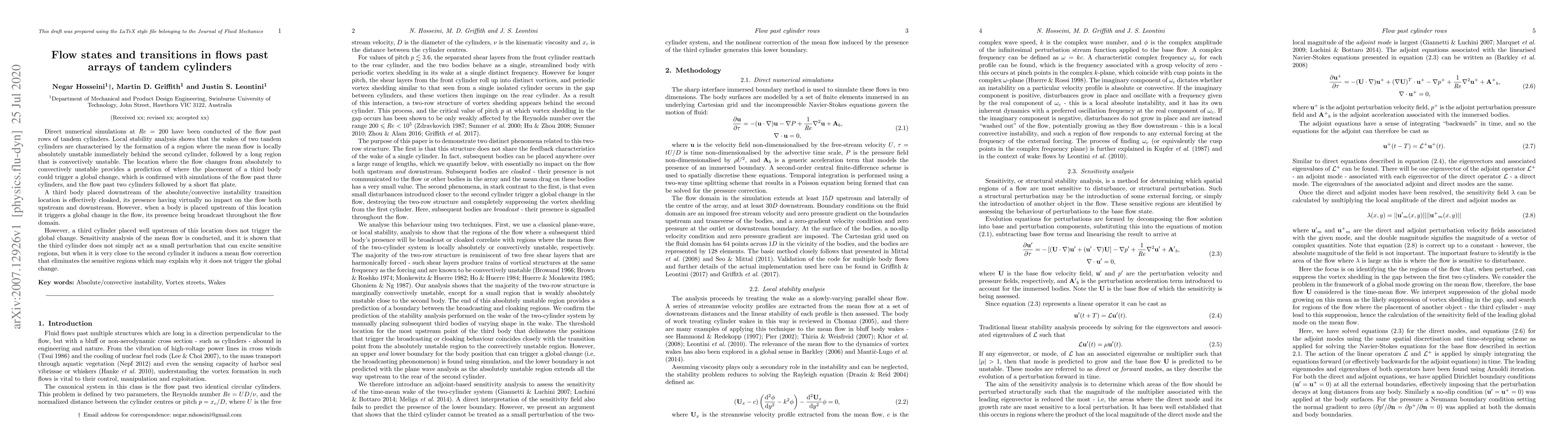 This paper investigates the flow dynamics past arrays of tandem cylinders using direct numerical simulations and local stability analysis. It identifies a critical transition point between absolute and convective instability that determines whether a third body placed downstream will "cloak" the flow or trigger a global change upstream.