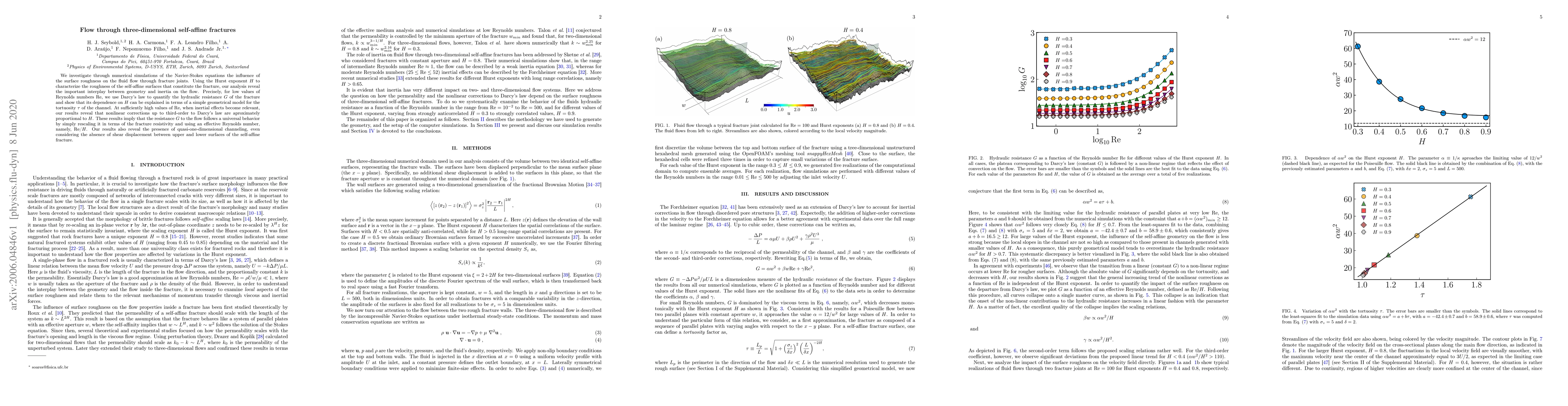 This paper uses numerical simulations to study fluid flow through three-dimensional self-affine fractures, revealing the interplay between surface roughness and flow dynamics. It shows that Darcy's law can describe low Reynolds number flows, while higher Reynolds numbers require third-order nonlinear corrections proportional to the Hurst exponent characterizing surface roughness.