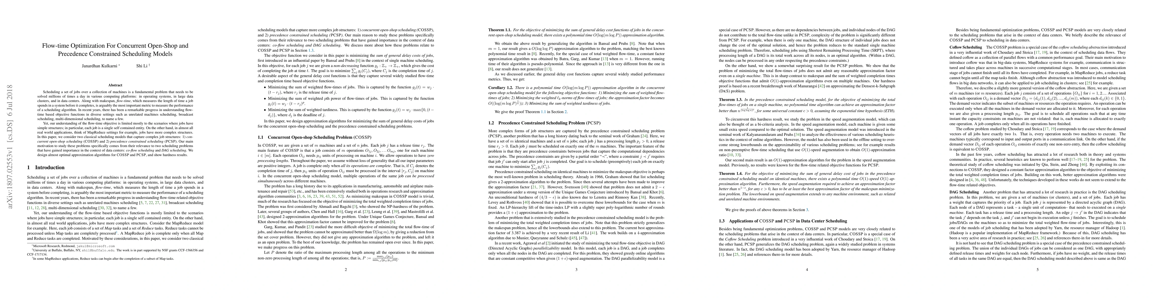 This paper investigates the optimization of flow-time for complex scheduling models, specifically concurrent open-shop and precedence constrained scheduling. It develops near-optimal approximation algorithms for these models, and highlights their relevance to co-flow and DAG scheduling in data centers, while also presenting associated computational hardness results.