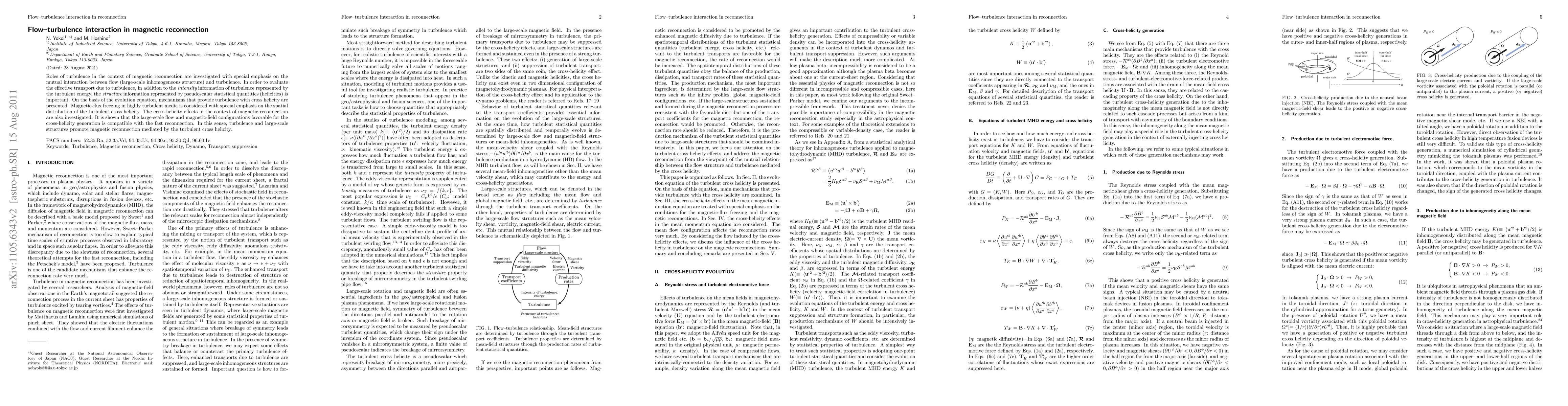 Roles of turbulence in the context of magnetic reconnection are investigated with special emphasis on the mutual interaction between flow (large-scale inhomogeneous structure) and turbulence. In order to evaluate the effective transport due to turbulence, in addition to the {\it intensity} information of turbulence represented by the turbulent energy, the {\it structure} information represented by pseudoscalar statistical quantities (helicities) is important. On the basis of the evolution equation, mechanisms that provide turbulence with cross helicity are presented. Magnetic-flux freezing in highly turbulent media is considered with special emphasis on the spatial distribution of the turbulent cross helicity. The cross-helicity effects in the context of magnetic reconnection are also investigated. It is shown that the large-scale flow and magnetic-field configurations favorable for the cross-helicity generation is compatible with the fast reconnection. In this sense, turbulence and large-scale structures promote magnetic reconnection mediated by the turbulent cross helicity.