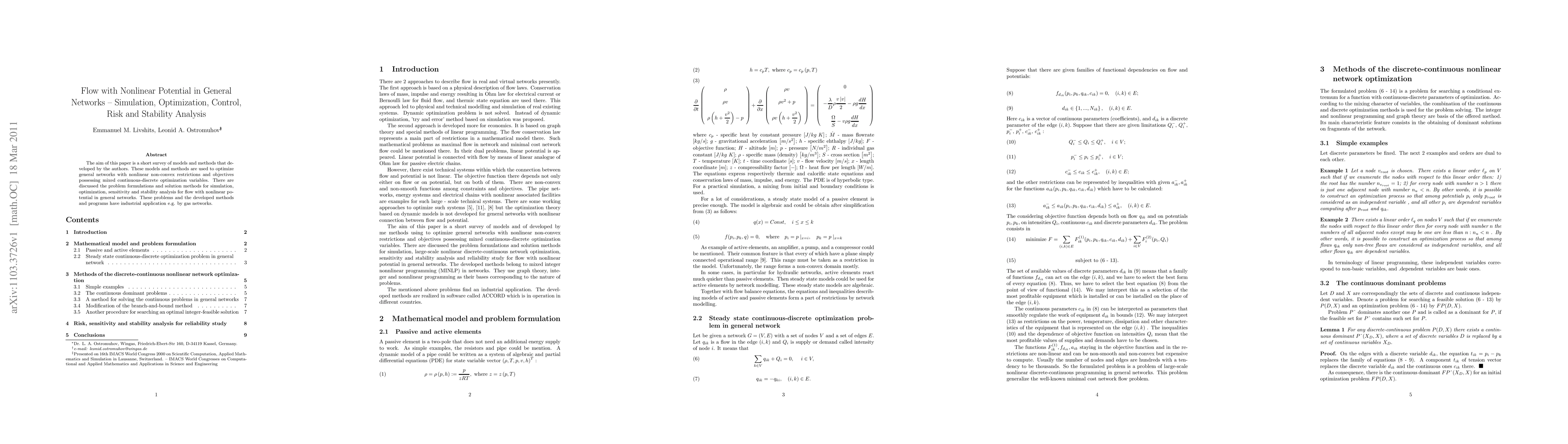 The aim of this paper is a short survey of models and methods that developed by the authors. These models and methods are used to optimize general networks with nonlinear non-convex restrictions and objectives possessing mixed continuous-discrete optimization variables. There are discussed the problem formulations and solution methods for simulation, optimization, sensitivity and stability analysis for flow with nonlinear potential in general networks. These problems and the developed methods and programs have industrial application e.g. by gas networks.
