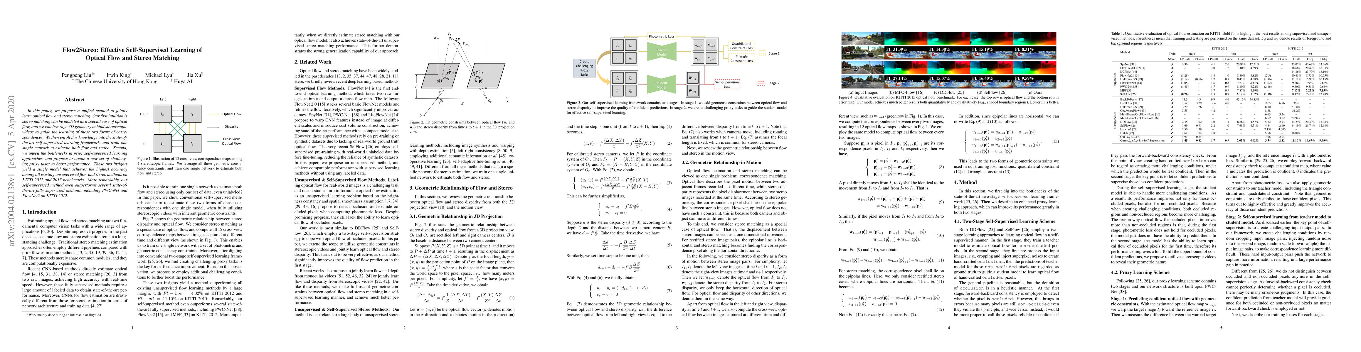 This paper proposes a unified self-supervised learning method to jointly estimate optical flow and stereo matching, leveraging 3D geometry from stereoscopic videos. It outperforms existing unsupervised and some supervised methods on KITTI benchmarks, achieving state-of-the-art accuracy.