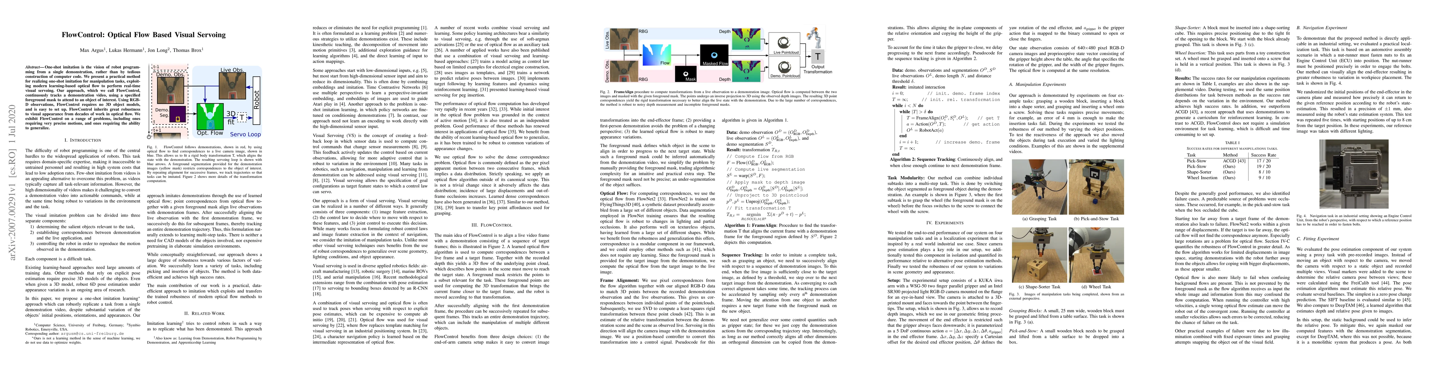 One-shot imitation is the vision of robot programming from a single demonstration, rather than by tedious construction of computer code. We present a practical method for realizing one-shot imitation for manipulation tasks, exploiting modern learning-based optical flow to perform real-time visual servoing. Our approach, which we call FlowControl, continuously tracks a demonstration video, using a specified foreground mask to attend to an object of interest. Using RGB-D observations, FlowControl requires no 3D object models, and is easy to set up. FlowControl inherits great robustness to visual appearance from decades of work in optical flow. We exhibit FlowControl on a range of problems, including ones requiring very precise motions, and ones requiring the ability to generalize.