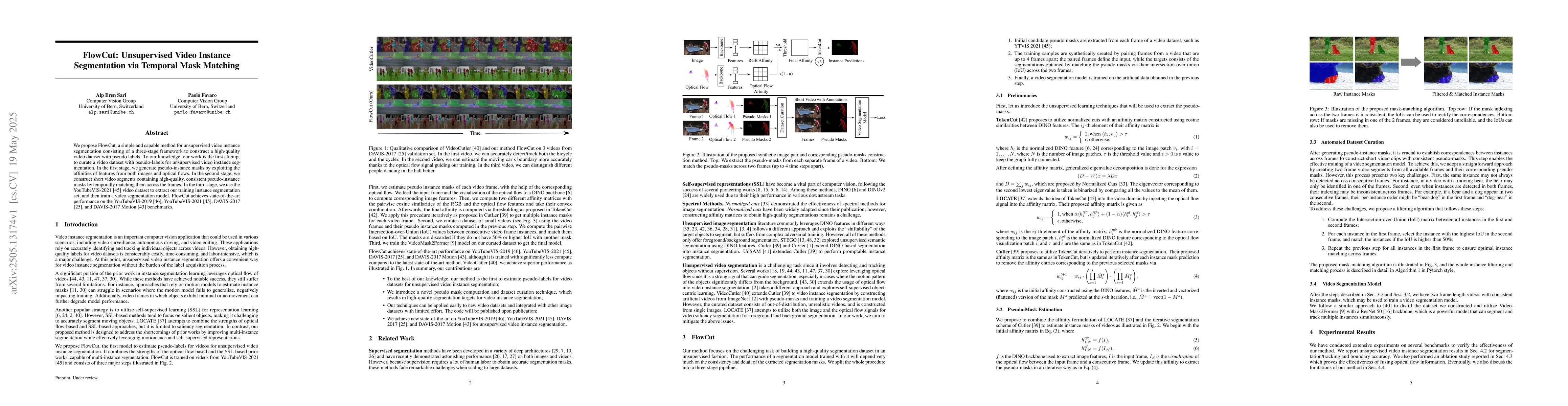 FlowCut proposes a three-stage framework for unsupervised video instance segmentation, achieving state-of-the-art performance on multiple benchmarks using pseudo-labels and temporal matching.