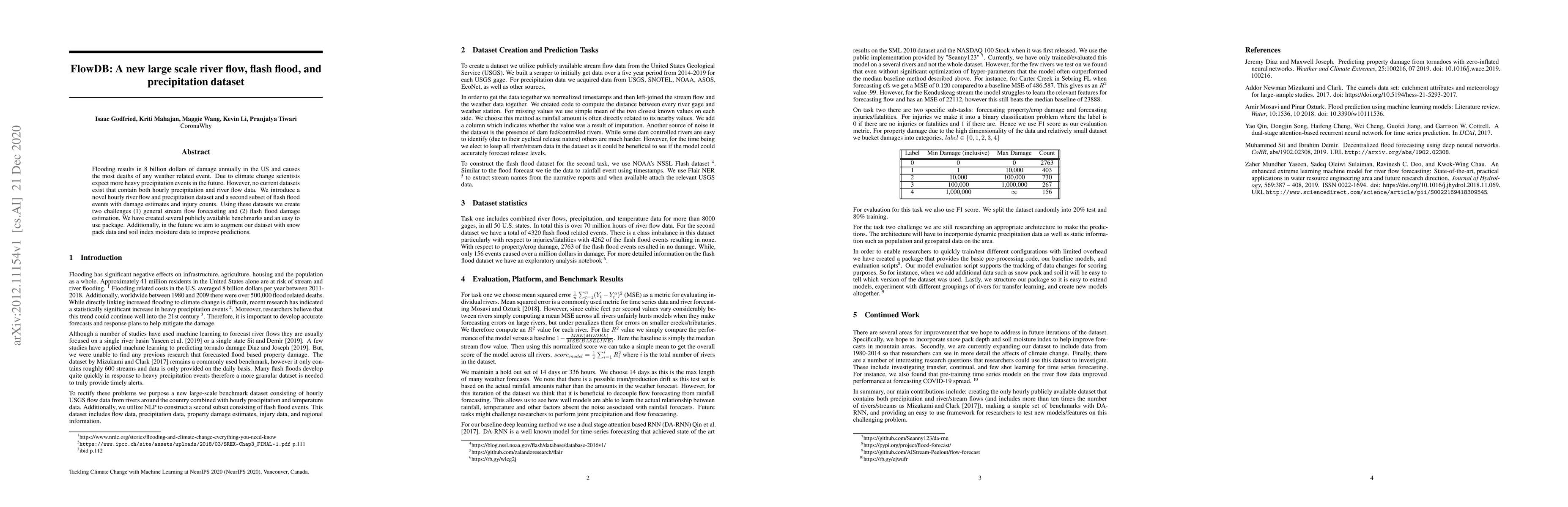 Flooding results in 8 billion dollars of damage annually in the US and causes the most deaths of any weather related event. Due to climate change scientists expect more heavy precipitation events in the future. However, no current datasets exist that contain both hourly precipitation and river flow data. We introduce a novel hourly river flow and precipitation dataset and a second subset of flash flood events with damage estimates and injury counts. Using these datasets we create two challenges (1) general stream flow forecasting and (2) flash flood damage estimation. We have created several publicly available benchmarks and an easy to use package. Additionally, in the future we aim to augment our dataset with snow pack data and soil index moisture data to improve predictions.