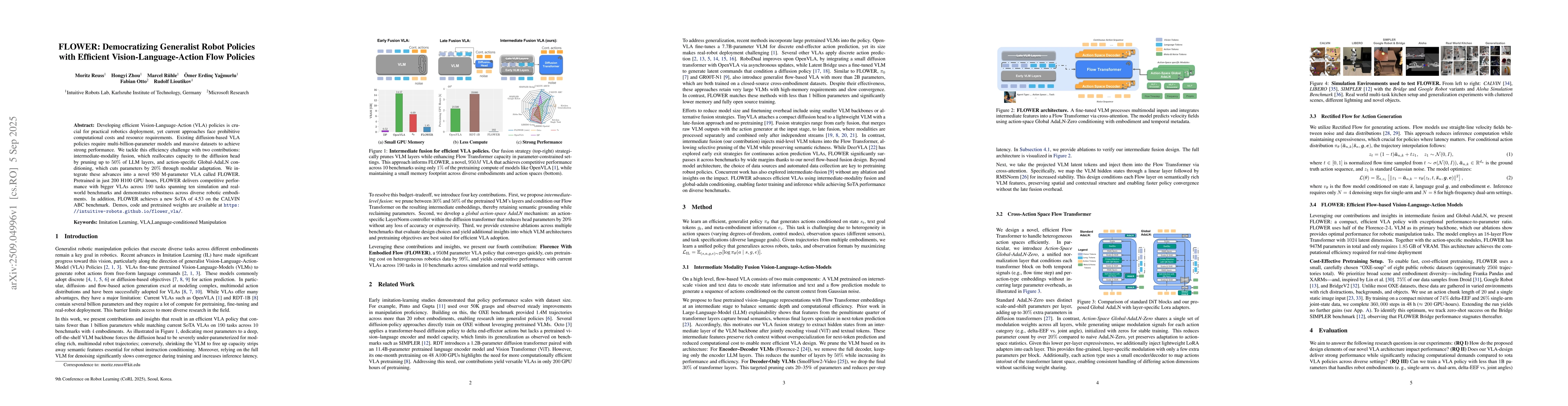 Developing efficient Vision-Language-Action (VLA) policies is crucial for practical robotics deployment, yet current approaches face prohibitive computational costs and resource requirements. Existing diffusion-based VLA policies require multi-billion-parameter models and massive datasets to achieve strong performance. We tackle this efficiency challenge with two contributions: intermediate-modality fusion, which reallocates capacity to the diffusion head by pruning up to $50\%$ of LLM layers, and action-specific Global-AdaLN conditioning, which cuts parameters by $20\%$ through modular adaptation. We integrate these advances into a novel 950 M-parameter VLA called FLOWER. Pretrained in just 200 H100 GPU hours, FLOWER delivers competitive performance with bigger VLAs across $190$ tasks spanning ten simulation and real-world benchmarks and demonstrates robustness across diverse robotic embodiments. In addition, FLOWER achieves a new SoTA of 4.53 on the CALVIN ABC benchmark. Demos, code and pretrained weights are available at https://intuitive-robots.github.io/flower_vla/.