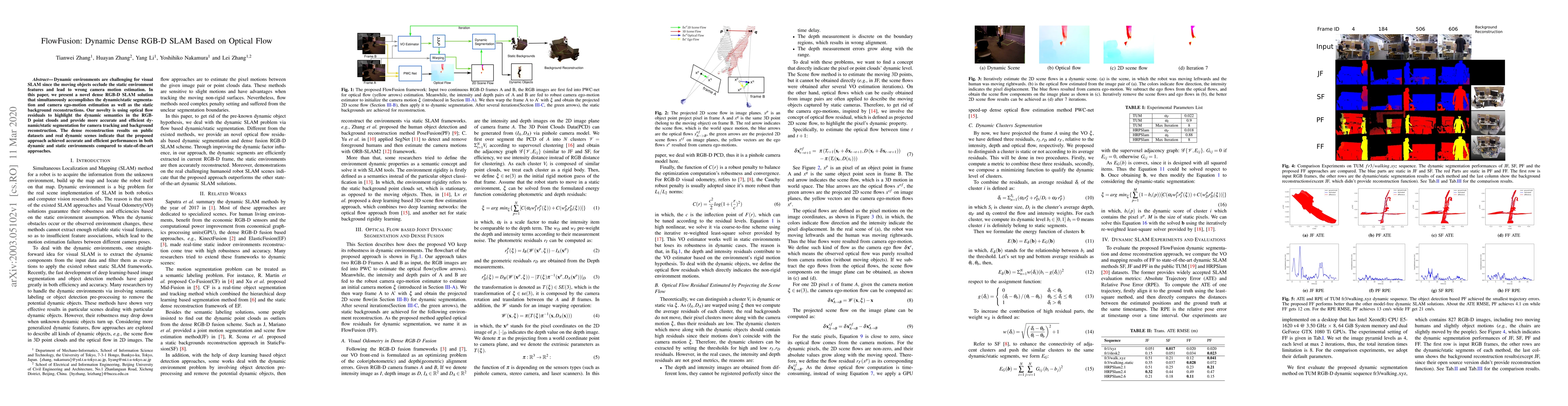 FlowFusion introduces a dynamic dense RGB-D SLAM system that leverages optical flow residuals for improved dynamic/static segmentation, enabling accurate camera motion estimation and background reconstruction in both static and dynamic environments. The method outperforms existing state-of-the-art techniques in dense reconstruction accuracy and efficiency.