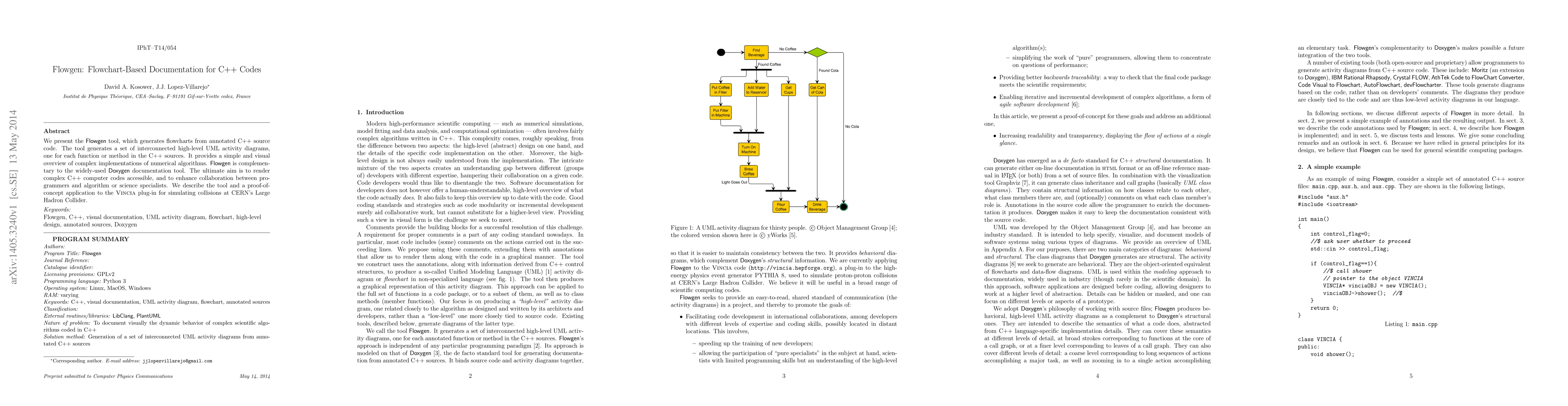 Flowgen is a tool that generates flowcharts from annotated C++ source code, producing UML activity diagrams for each function to provide a visual overview of complex implementations. It aims to enhance collaboration and accessibility for C++ codes, demonstrated through a proof-of-concept application to the VINCIA plug-in at CERN.