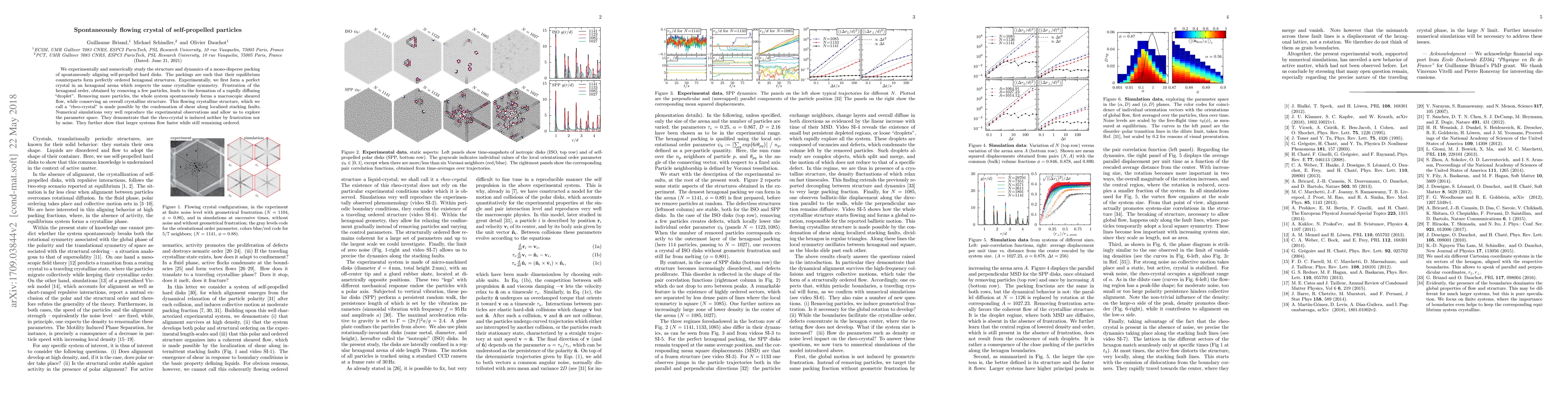 We experimentally and numerically study the structure and dynamics of a mono-disperse packing of spontaneously aligning self-propelled hard disks. The packings are such that their equilibrium counterparts form perfectly ordered hexagonal structures. Experimentally, we first form a perfect crystal in an hexagonal arena which respects the same crystalline symmetry. Frustration of the hexagonal order, obtained by removing a few particles, leads to the formation of a rapidly diffusing "droplet". Removing more particles, the whole system spontaneously forms a macroscopic sheared flow, while conserving an overall crystalline structure. This flowing crystalline structure, which we call a "rheo-crystal" is made possible by the condensation of shear along localized stacking faults. Numerical simulations very well reproduce the experimental observations and allow us to explore the parameter space. They demonstrate that the rheo-crystal is induced neither by frustration nor by noise. They further show that larger systems flow faster while still remaining ordered.