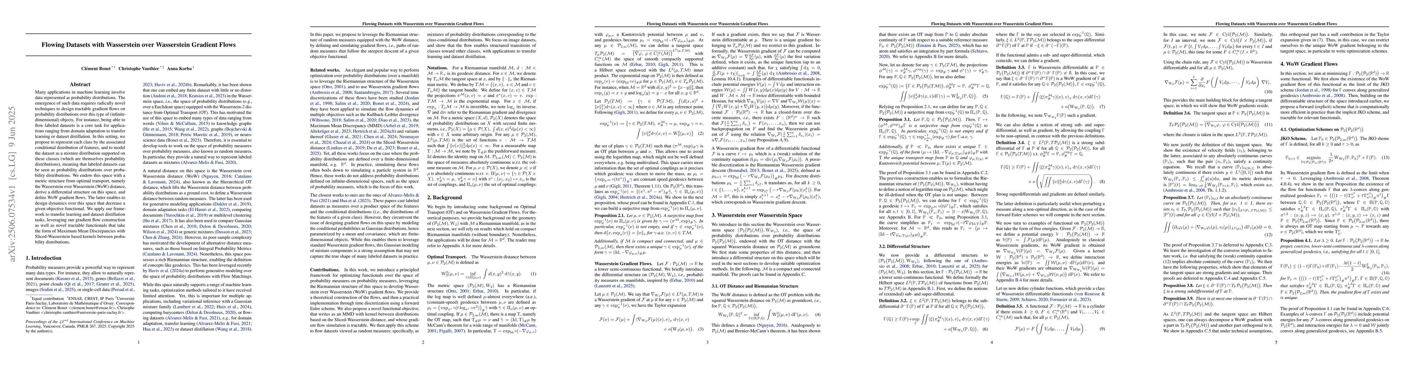 Many applications in machine learning involve data represented as probability distributions. The emergence of such data requires radically novel techniques to design tractable gradient flows on probability distributions over this type of (infinite-dimensional) objects. For instance, being able to flow labeled datasets is a core task for applications ranging from domain adaptation to transfer learning or dataset distillation. In this setting, we propose to represent each class by the associated conditional distribution of features, and to model the dataset as a mixture distribution supported on these classes (which are themselves probability distributions), meaning that labeled datasets can be seen as probability distributions over probability distributions. We endow this space with a metric structure from optimal transport, namely the Wasserstein over Wasserstein (WoW) distance, derive a differential structure on this space, and define WoW gradient flows. The latter enables to design dynamics over this space that decrease a given objective functional. We apply our framework to transfer learning and dataset distillation tasks, leveraging our gradient flow construction as well as novel tractable functionals that take the form of Maximum Mean Discrepancies with Sliced-Wasserstein based kernels between probability distributions.