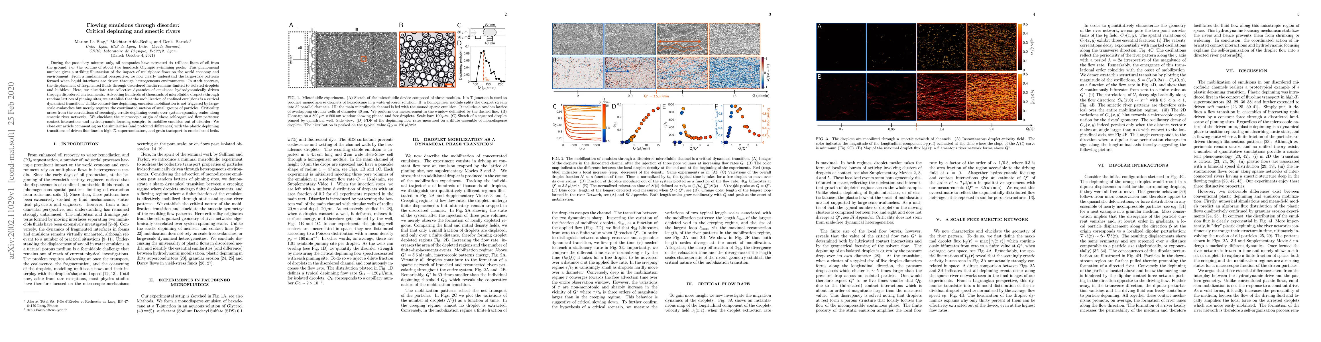 During the past sixty minutes only, oil companies have extracted six trillions liters of oil from the ground, i.e. the volume of about two hundreds Olympic swimming pools. This phenomenal number gives a striking illustration of the impact of multiphase flows on the world economy and environment. From a fundamental perspective, we now clearly understand the large-scale patterns formed when liquid interfaces are driven through heterogeneous environments. In stark contrast, the displacement of fragmented fluids through disordered media remains limited to isolated droplets and bubbles. Here, we elucidate the collective dynamics of emulsions hydrodynamically driven through disordered environments. Advecting hundreds of thousands of microfluidic droplets through random lattices of pinning sites, we establish that the mobilization of confined emulsions is a critical dynamical transition. Unlike contact-line depinning, emulsion mobilization is not triggered by large-scale avalanches but merely requires the coordinated motion of small groups of particles. Criticality arises from the correlations of seemingly erratic depinning events over system-spanning scales along smectic river networks. We elucidate the microscopic origin of these self-organized flow patterns: contact interactions and hydrodynamic focusing conspire to mobilize emulsion out of disorder. We close our article commenting on the similarities (and profound differences) with the plastic depinning transitions of driven flux lines in high-$T_{\rm c}$ superconductors, and grain transport in eroded sand beds.