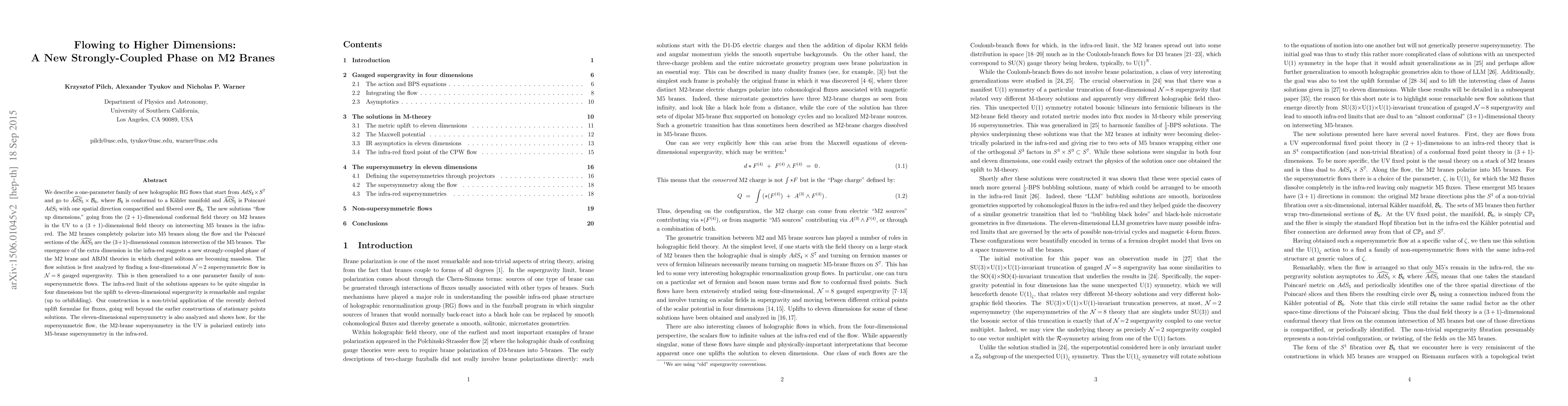 We describe a one-parameter family of new holographic RG flows that start from $AdS_4 \times S^7$ and go to $\widehat{AdS_5} \times {\cal B}_6$, where ${\cal B}_6$ is conformal to a K\"ahler manifold and $\widehat{AdS_5}$ is Poincar\'e $AdS_5$ with one spatial direction compactified and fibered over ${\cal B}_6$. The new solutions "flow up dimensions," going from the $(2+1)$-dimensional conformal field theory on M2 branes in the UV to a $(3+1)$-dimensional field theory on intersecting M5 branes in the infra-red. The M2 branes completely polarize into M5 branes along the flow and the Poincar\'e sections of the $\widehat{AdS_5}$ are the $(3+1)$-dimensional common intersection of the M5 branes. The emergence of the extra dimension in the infra-red suggests a new strongly-coupled phase of the M2 brane and ABJM theories in which charged solitons are becoming massless. The flow solution is first analyzed by finding a four-dimensional $N \! = \! 2$ supersymmetric flow in $N \! = \! 8$ gauged supergravity. This is then generalized to a one parameter family of non-supersymmetric flows. The infra-red limit of the solutions appears to be quite singular in four dimensions but the uplift to eleven-dimensional supergravity is remarkable and regular (up to orbifolding). Our construction is a non-trivial application of the recently derived uplift formulae for fluxes, going well beyond the earlier constructions of stationary points solutions. The eleven-dimensional supersymmetry is also analyzed and shows how, for the supersymmetric flow, the M2-brane supersymmetry in the UV is polarized entirely into M5-brane supersymmetry in the infra-red.