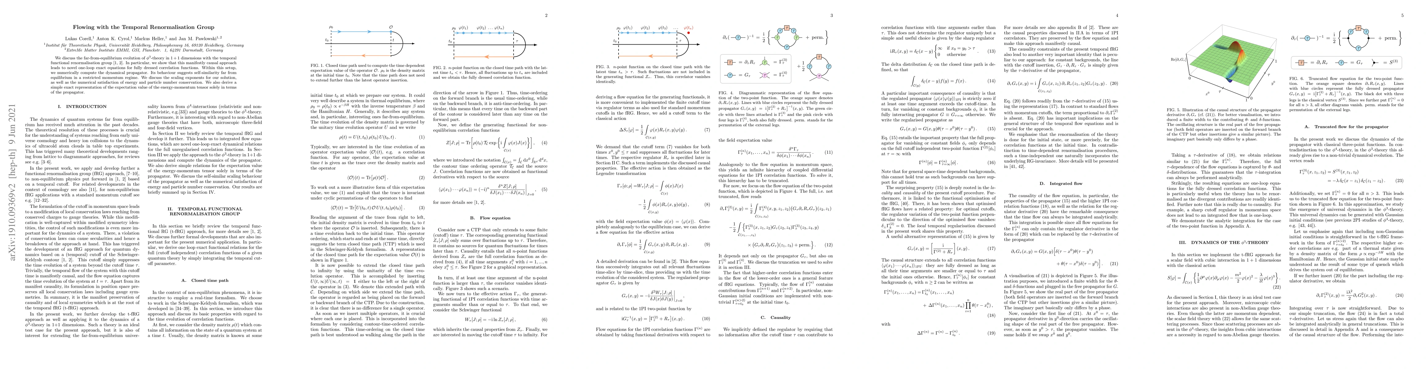 We discuss the far-from-equilibrium evolution of $\phi^3$-theory in $1+1$ dimensions with the temporal functional renormalisation group \cite{Gasenzer:2007za, Gasenzer:2010rq}. In particular, we show that this manifestly causal approach leads to novel one-loop exact equations for fully dressed correlation functions. Within this setup, we numerically compute the dynamical propagator. Its behaviour suggests self-similarity far from equilibrium in a restricted momentum regime. We discuss the scaling exponents for our solution, as well as the numerical satisfaction of energy and particle number conservation. We also derive a simple exact representation of the expectation value of the energy-momentum tensor solely in terms of the propagator.