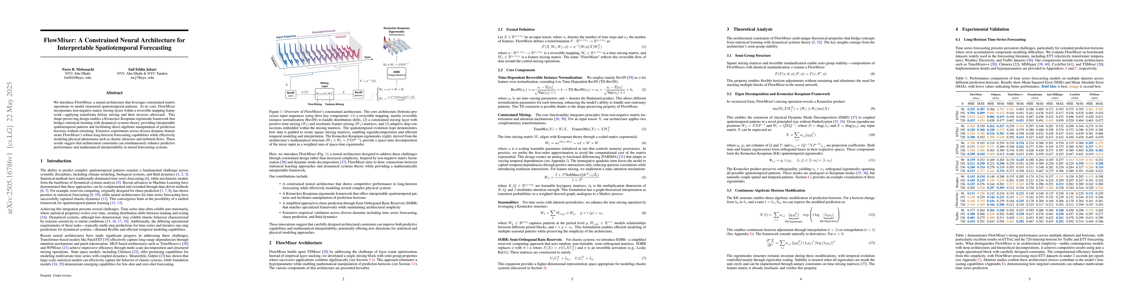FlowMixer introduces a novel constrained neural architecture that incorporates non-negative matrix mixing layers within a reversible mapping framework, enabling Kronecker-Koopman eigenmode analysis for interpretable spatiotemporal forecasting.